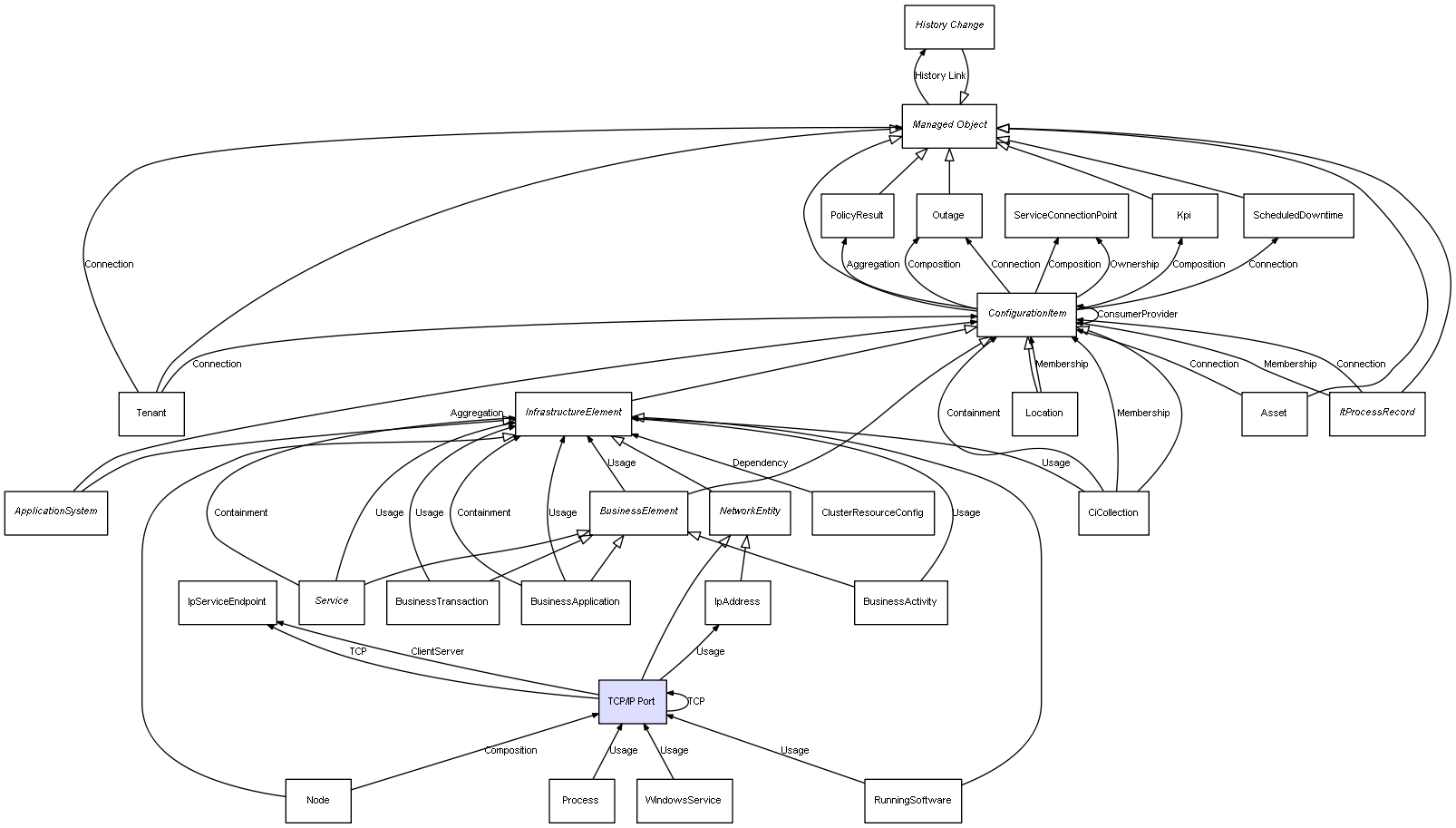 | TCP/IP Port | IpServiceEndpoint | ClientServer | The Client-Server relationship indicates the two CIs communicate with each other where one CI acts as a client while the other acts a server. |