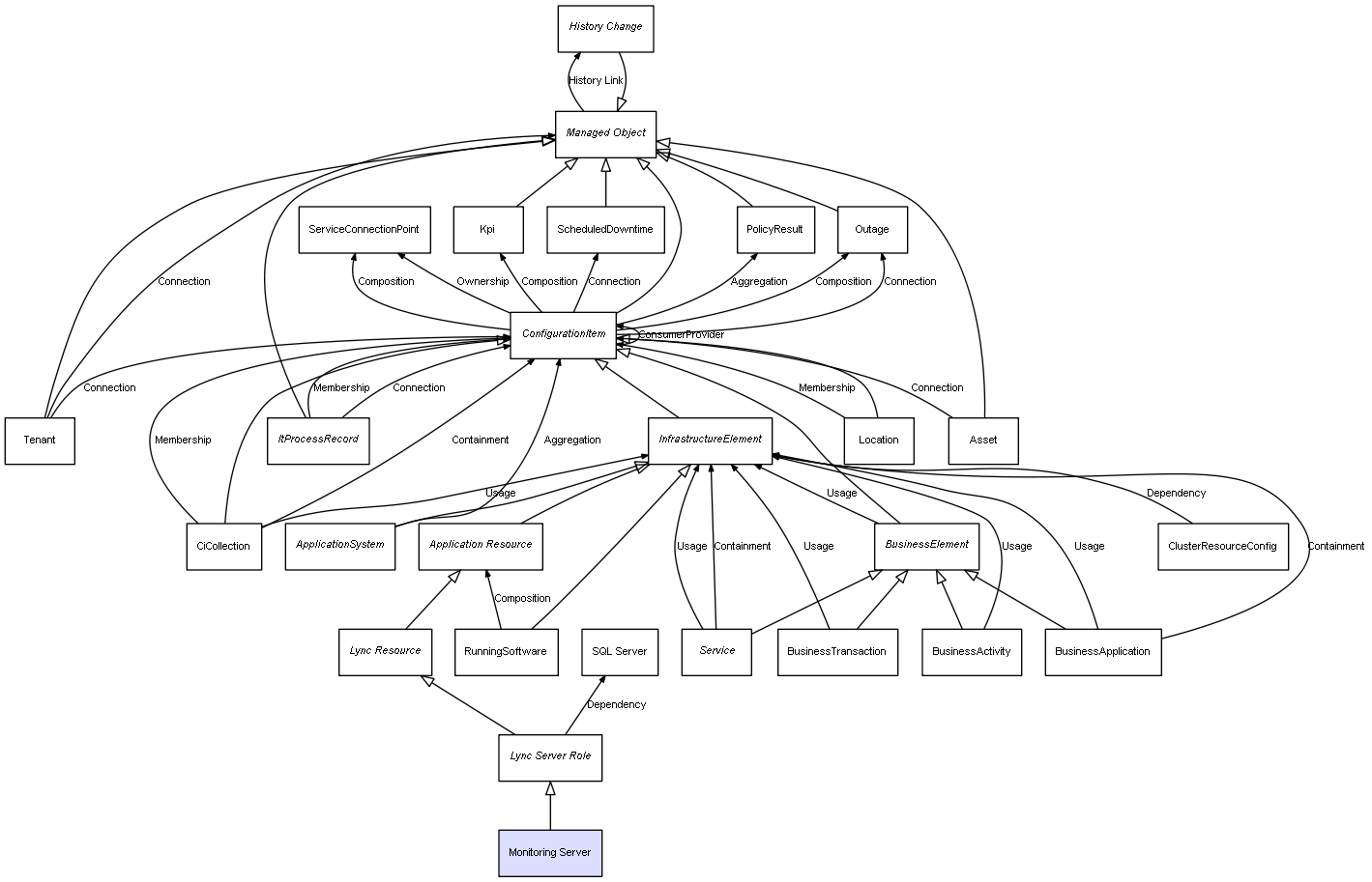 | ConfigurationItem | ServiceConnectionPoint | Composition | Represents a relation between 2 objects where one is contained within the other, and the included object can not exist without its container. Therefore, when the container is deleted, all its contained object will be automatically removed |