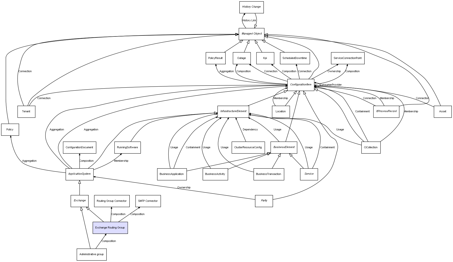 | Administrative group | Exchange Routing Group | Composition | Represents a relation between 2 objects where one is contained within the other, and the included object can not exist without its container. Therefore, when the container is deleted, all its contained object will be automatically removed |