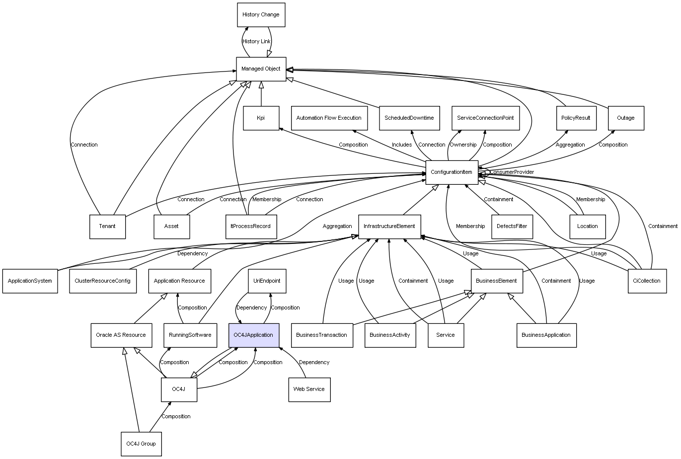 | OC4J | OC4JApplication | Composition | Represents a relation between 2 objects where one is contained within the other, and the included object can not exist without its container. Therefore, when the container is deleted, all its contained object will be automatically removed |