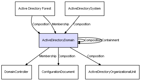 | Active Directory Forest | ActiveDirectoryDomain | Composition | Represents a relation between 2 objects where one is contained within the other, and the included object can not exist without its container. Therefore, when the container is deleted, all its contained object will be automatically removed |