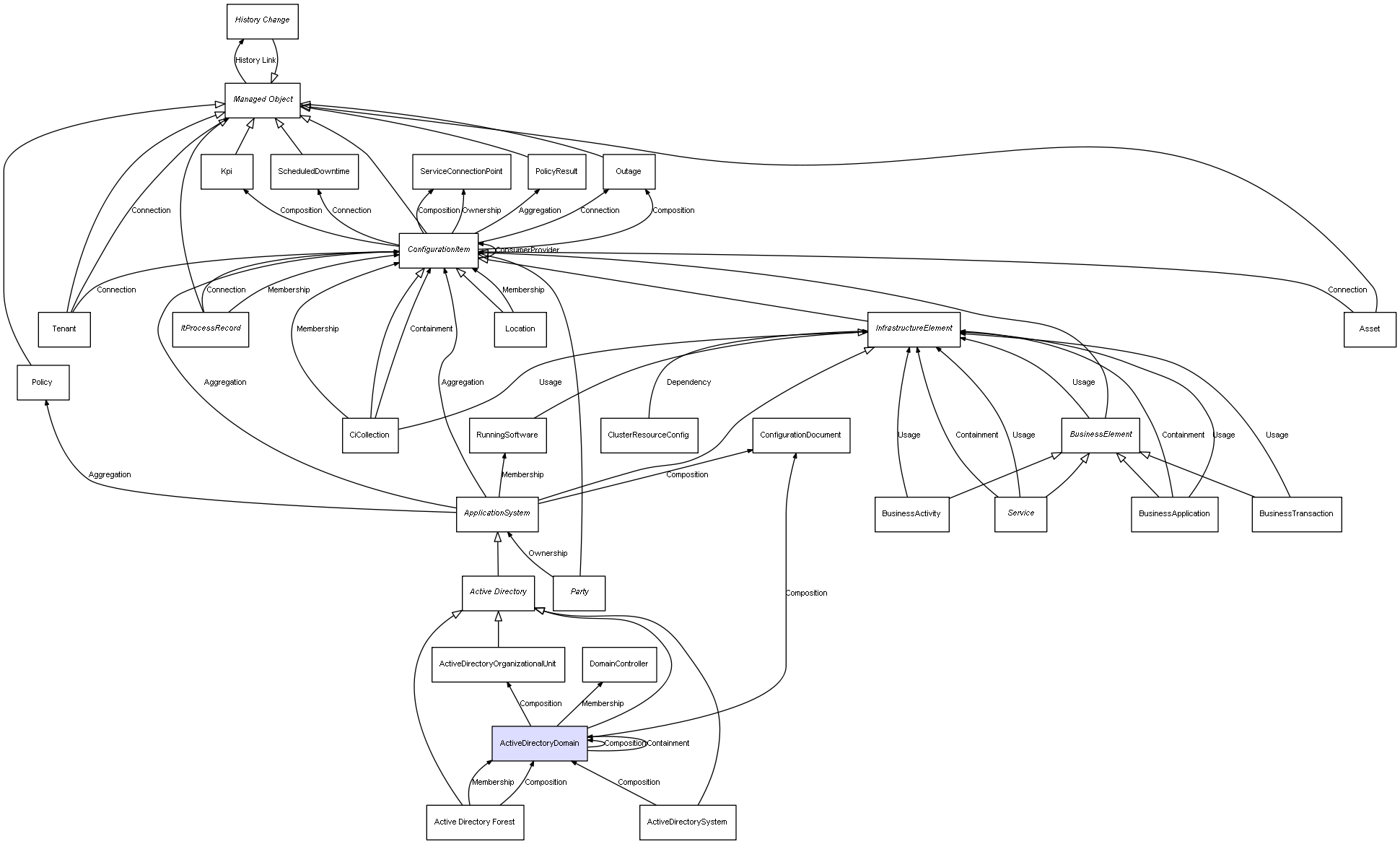 | ActiveDirectoryDomain | ActiveDirectoryDomain | Composition | Represents a relation between 2 objects where one is contained within the other, and the included object can not exist without its container. Therefore, when the container is deleted, all its contained object will be automatically removed |