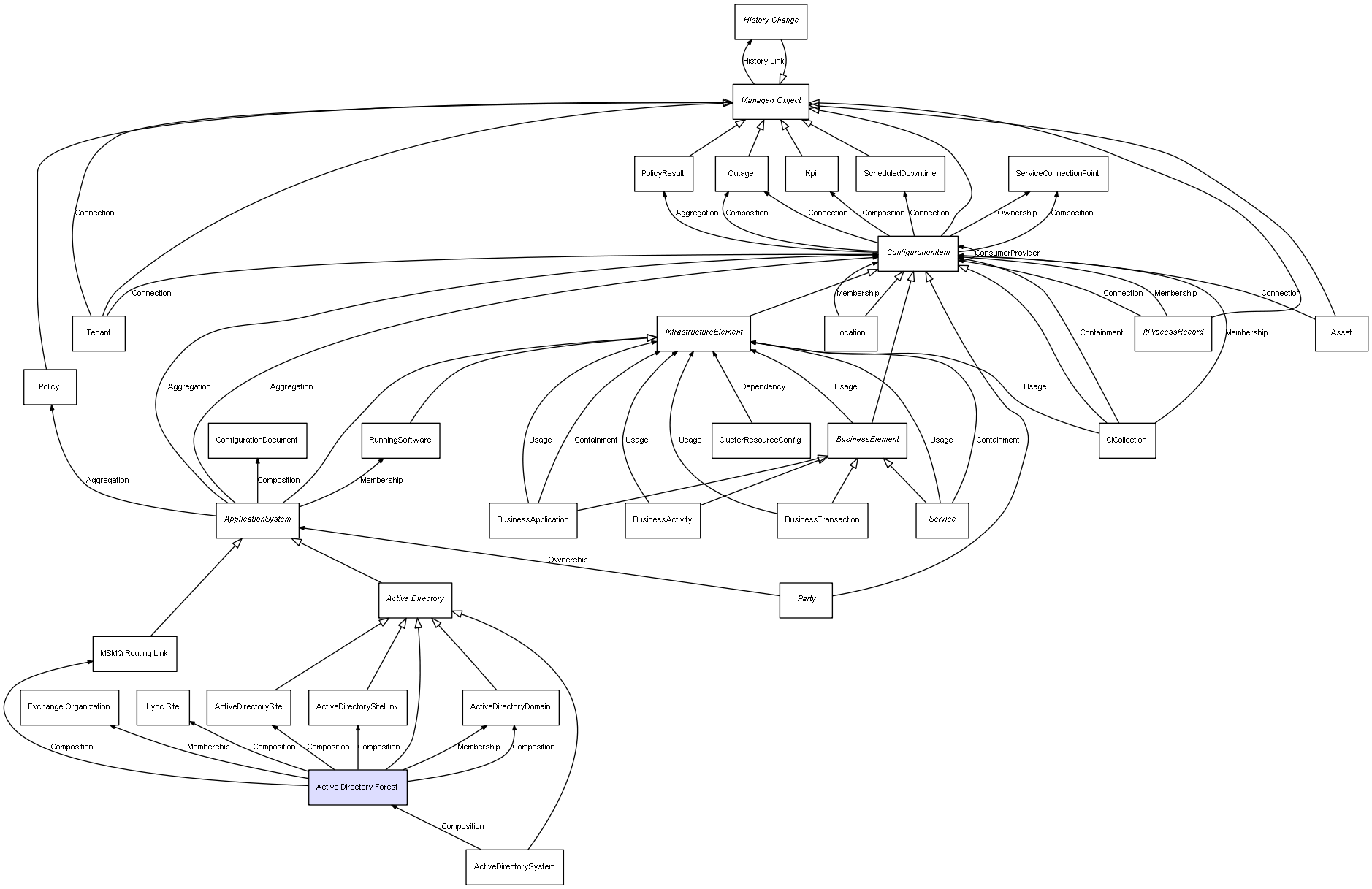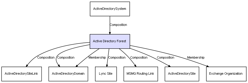 | Active Directory Forest | MSMQ Routing Link | Composition | Represents a relation between 2 objects where one is contained within the other, and the included object can not exist without its container. Therefore, when the container is deleted, all its contained object will be automatically removed |