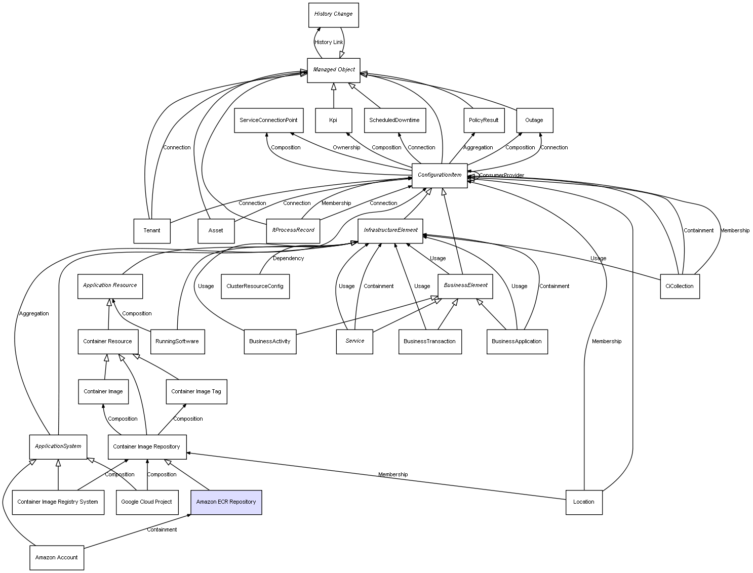| ConfigurationItem | ServiceConnectionPoint | Composition | Represents a relation between 2 objects where one is contained within the other, and the included object can not exist without its container. Therefore, when the container is deleted, all its contained object will be automatically removed |