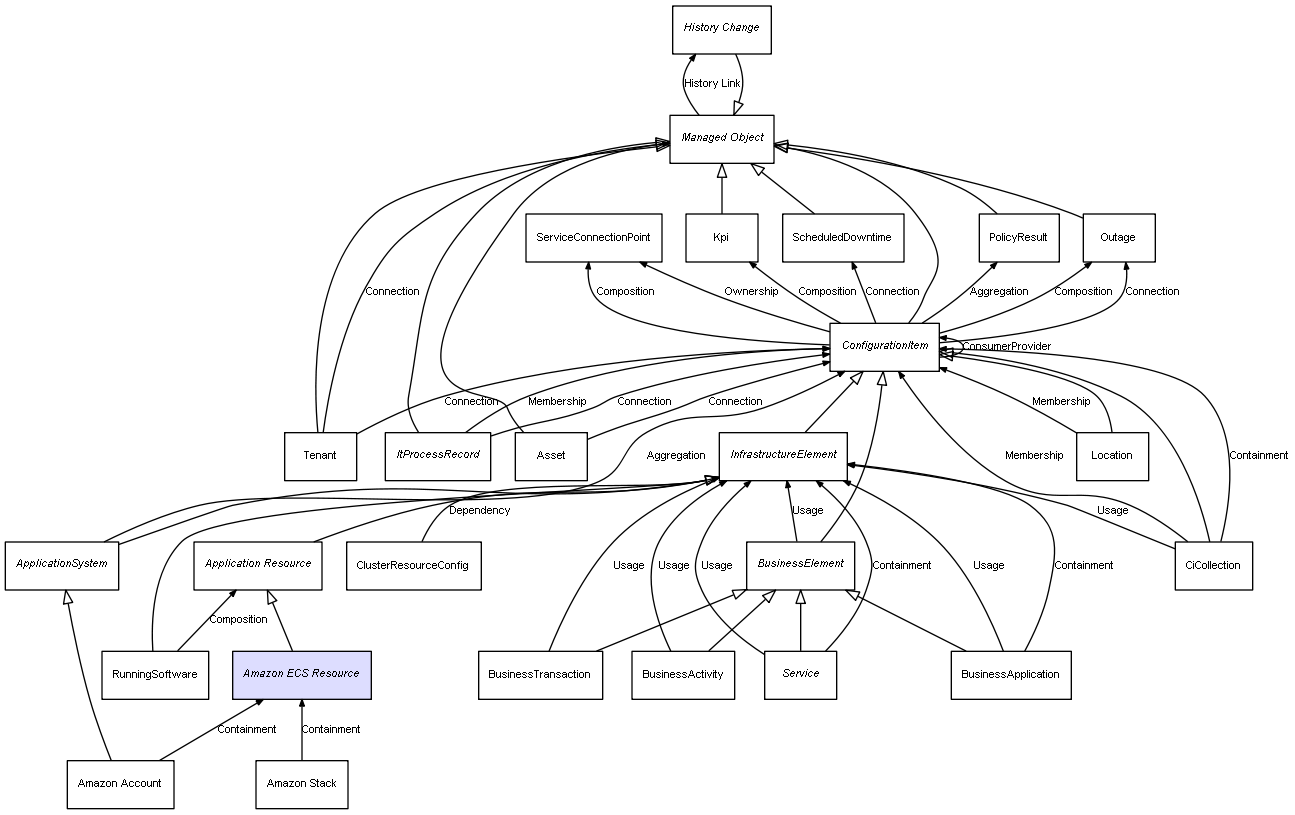 | ConfigurationItem | ServiceConnectionPoint | Composition | Represents a relation between 2 objects where one is contained within the other, and the included object can not exist without its container. Therefore, when the container is deleted, all its contained object will be automatically removed |