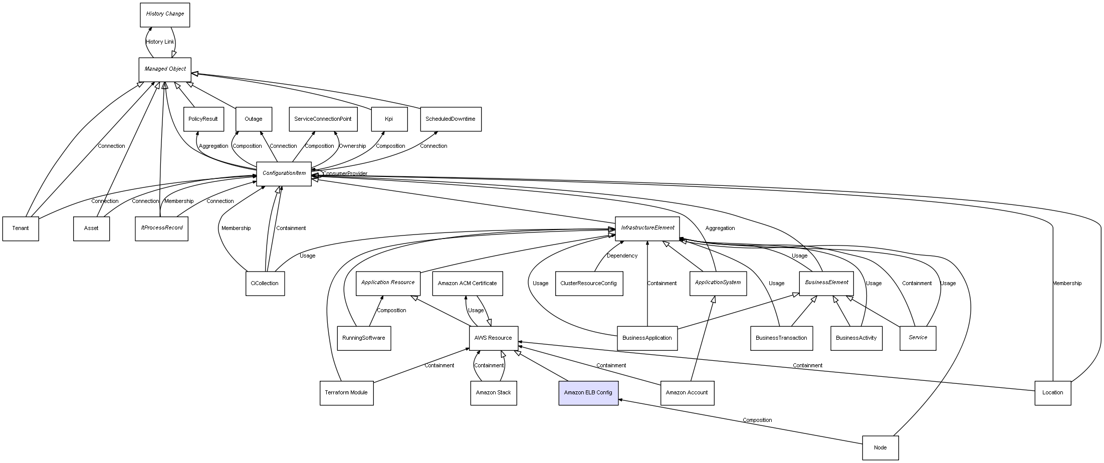 | Node | Amazon ELB Config | Composition | Represents a relation between 2 objects where one is contained within the other, and the included object can not exist without its container. Therefore, when the container is deleted, all its contained object will be automatically removed |