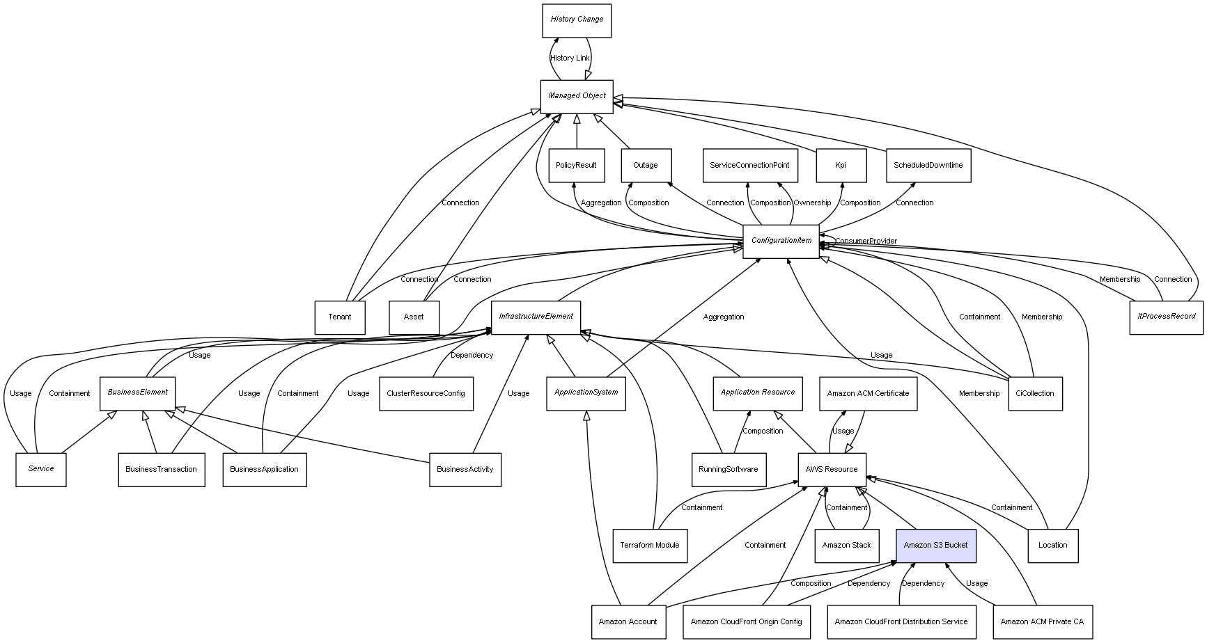 | Amazon Account | Amazon S3 Bucket | Composition | Represents a relation between 2 objects where one is contained within the other, and the included object can not exist without its container. Therefore, when the container is deleted, all its contained object will be automatically removed |