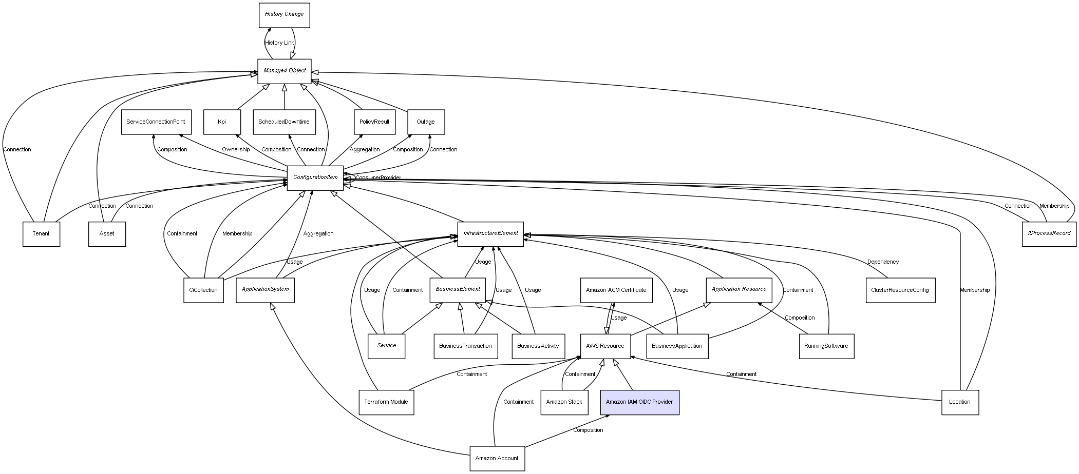 | Amazon Account | Amazon IAM OIDC Provider | Composition | Represents a relation between 2 objects where one is contained within the other, and the included object can not exist without its container. Therefore, when the container is deleted, all its contained object will be automatically removed |