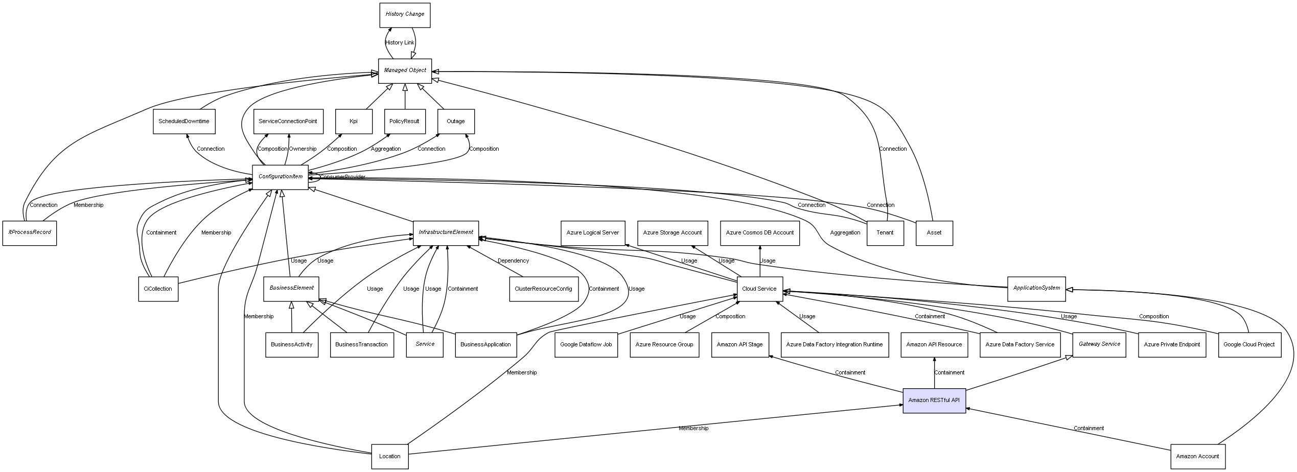 | ConfigurationItem | ServiceConnectionPoint | Composition | Represents a relation between 2 objects where one is contained within the other, and the included object can not exist without its container. Therefore, when the container is deleted, all its contained object will be automatically removed |