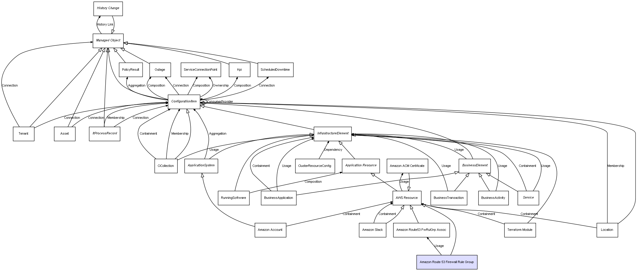 | ConfigurationItem | ServiceConnectionPoint | Composition | Represents a relation between 2 objects where one is contained within the other, and the included object can not exist without its container. Therefore, when the container is deleted, all its contained object will be automatically removed |