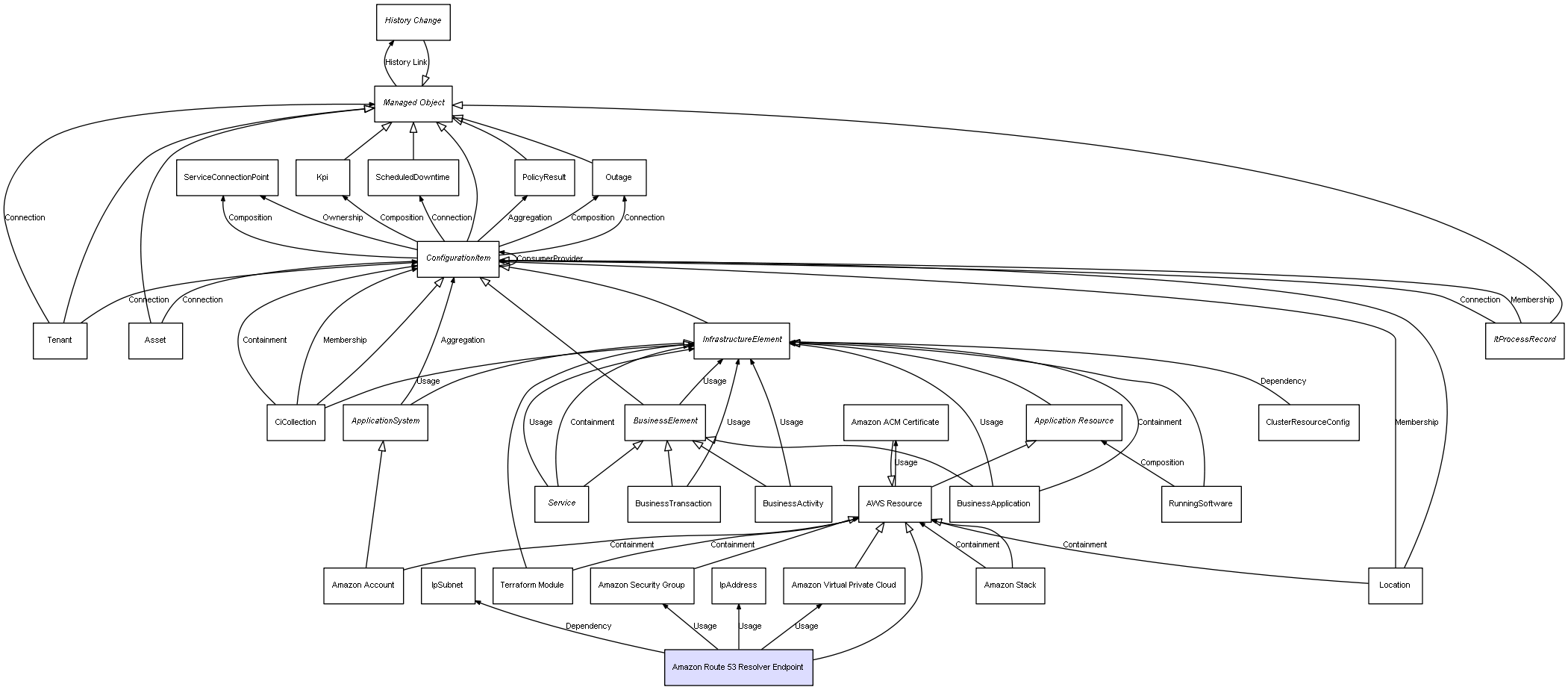 | ConfigurationItem | ServiceConnectionPoint | Composition | Represents a relation between 2 objects where one is contained within the other, and the included object can not exist without its container. Therefore, when the container is deleted, all its contained object will be automatically removed |