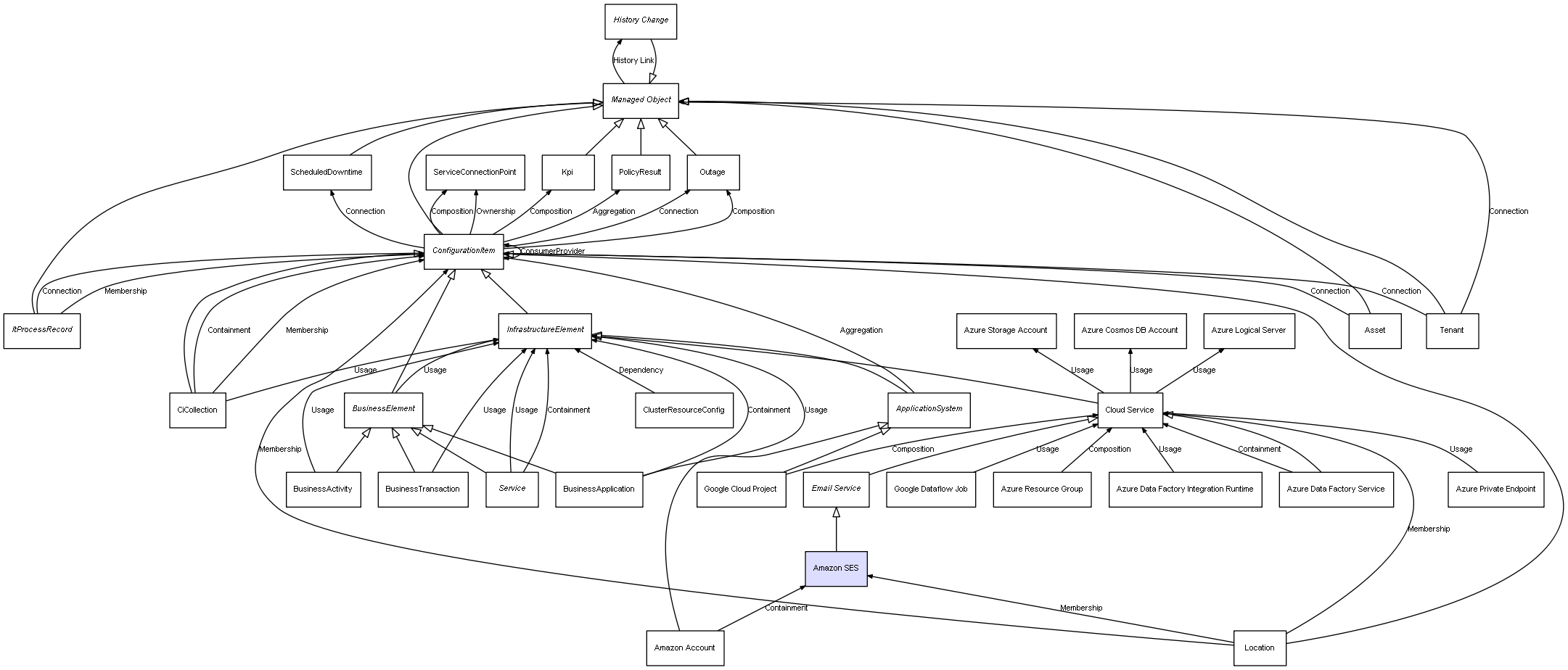 | ConfigurationItem | ServiceConnectionPoint | Composition | Represents a relation between 2 objects where one is contained within the other, and the included object can not exist without its container. Therefore, when the container is deleted, all its contained object will be automatically removed |