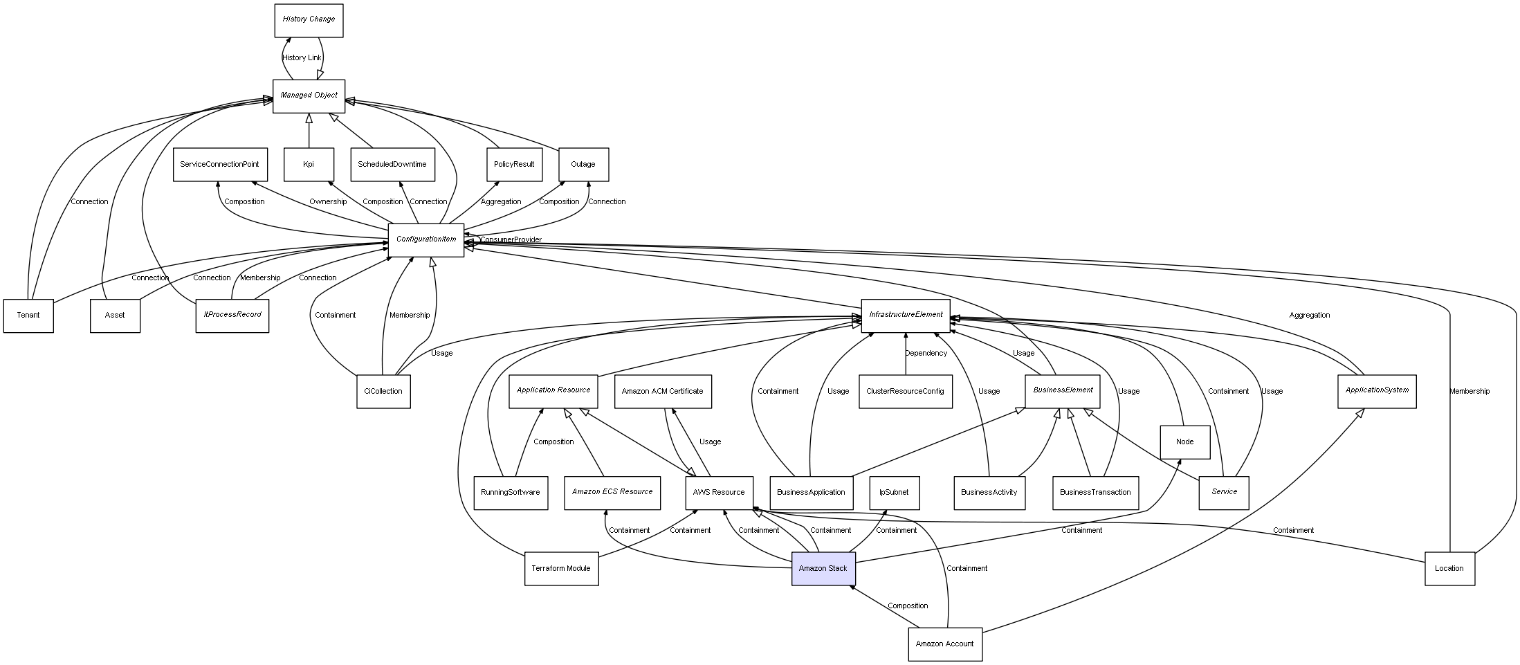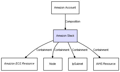 | Amazon Account | Amazon Stack | Composition | Represents a relation between 2 objects where one is contained within the other, and the included object can not exist without its container. Therefore, when the container is deleted, all its contained object will be automatically removed |
