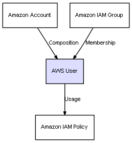 | Amazon Account | AWS User | Composition | Represents a relation between 2 objects where one is contained within the other, and the included object can not exist without its container. Therefore, when the container is deleted, all its contained object will be automatically removed |