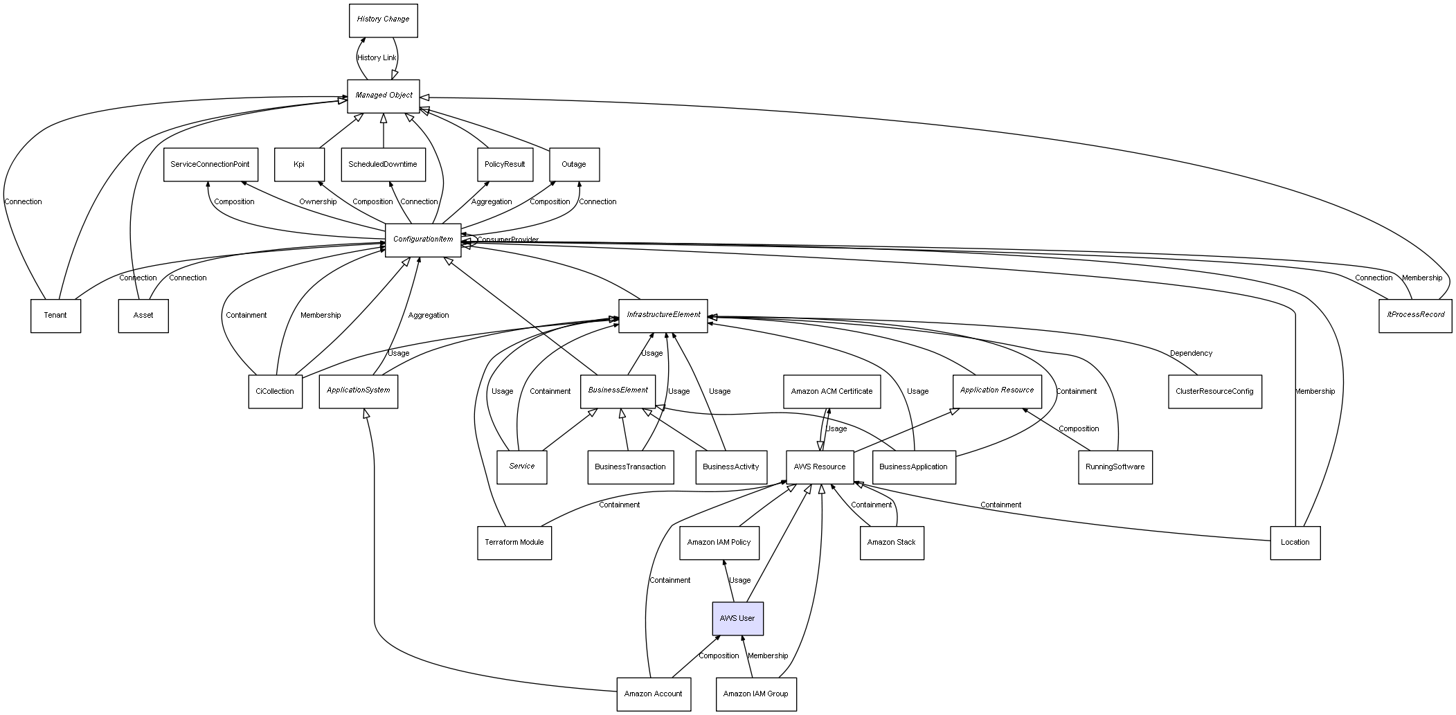 | ConfigurationItem | ServiceConnectionPoint | Composition | Represents a relation between 2 objects where one is contained within the other, and the included object can not exist without its container. Therefore, when the container is deleted, all its contained object will be automatically removed |