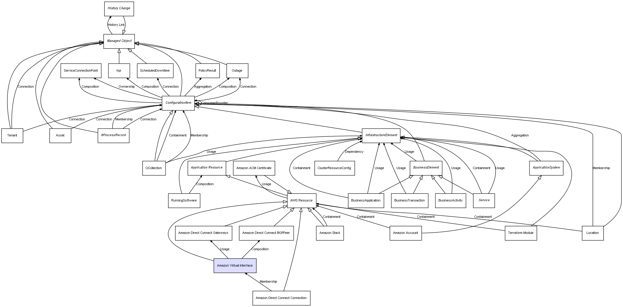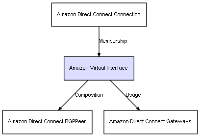 | Amazon Virtual Interface | Amazon Direct Connect BGPPeer | Composition | Represents a relation between 2 objects where one is contained within the other, and the included object can not exist without its container. Therefore, when the container is deleted, all its contained object will be automatically removed |