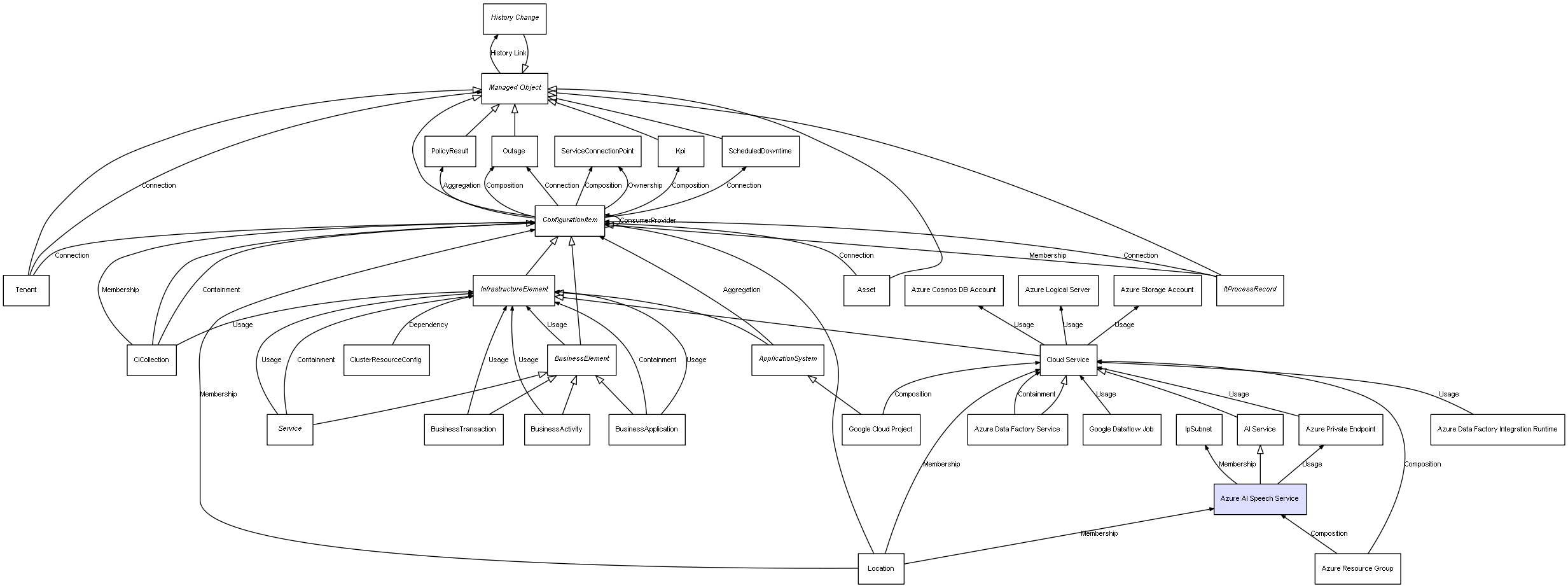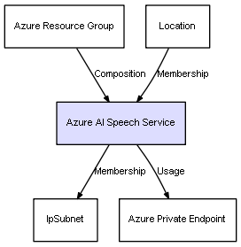 | Azure Resource Group | Azure AI Speech Service | Composition | Represents a relation between 2 objects where one is contained within the other, and the included object can not exist without its container. Therefore, when the container is deleted, all its contained object will be automatically removed |