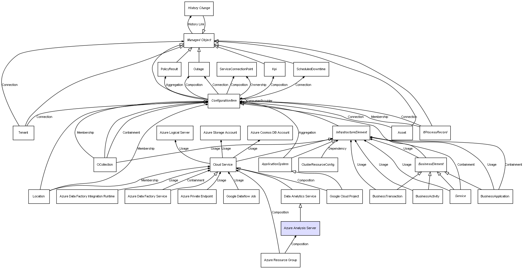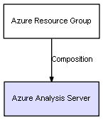 | Azure Resource Group | Azure Analysis Server | Composition | Represents a relation between 2 objects where one is contained within the other, and the included object can not exist without its container. Therefore, when the container is deleted, all its contained object will be automatically removed |