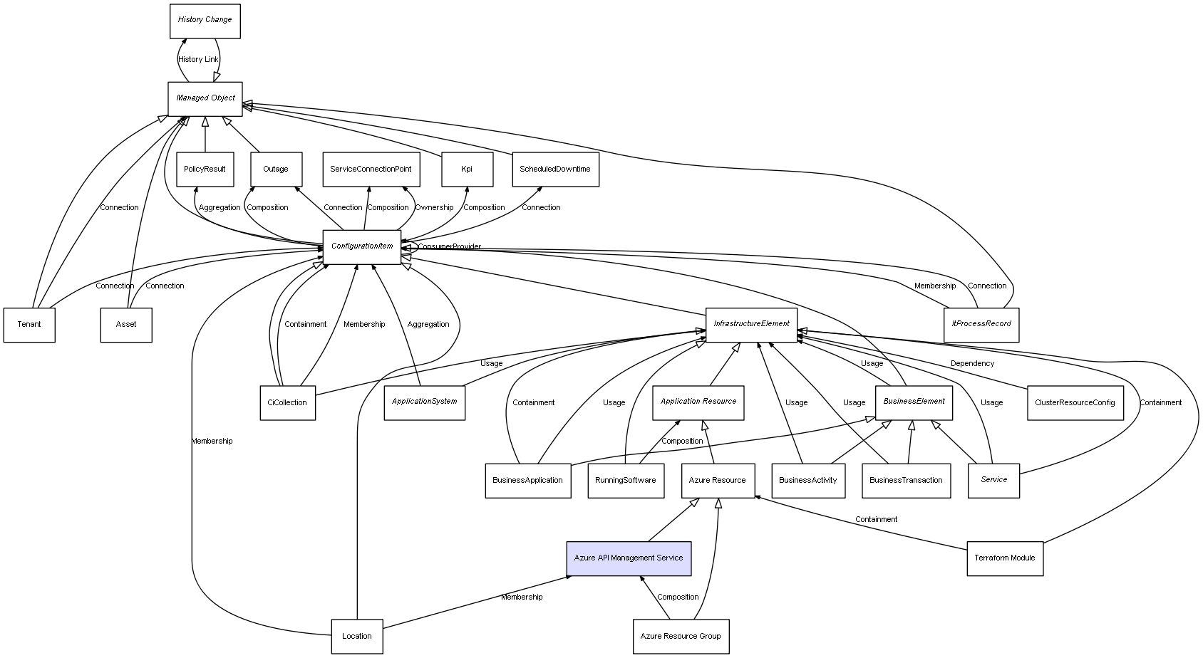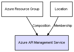 | Azure Resource Group | Azure API Management Service | Composition | Represents a relation between 2 objects where one is contained within the other, and the included object can not exist without its container. Therefore, when the container is deleted, all its contained object will be automatically removed |