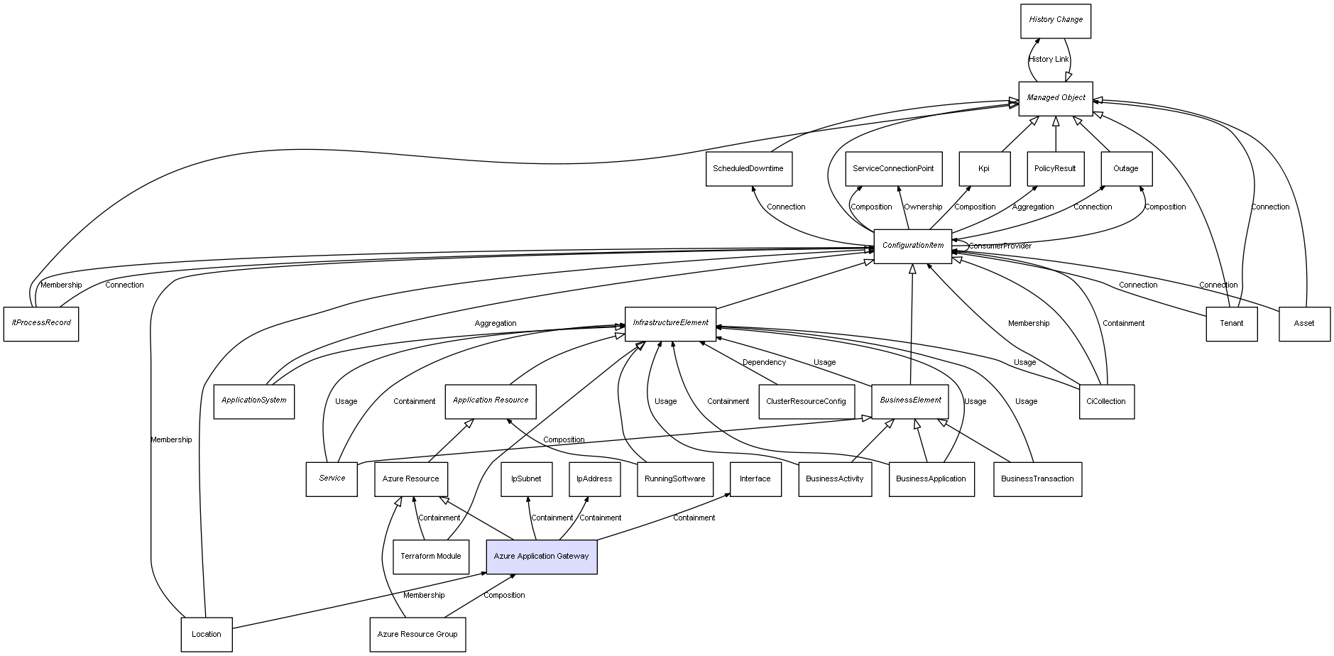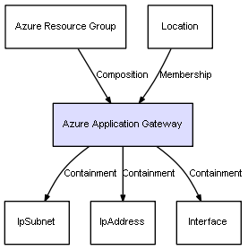 | Azure Resource Group | Azure Application Gateway | Composition | Represents a relation between 2 objects where one is contained within the other, and the included object can not exist without its container. Therefore, when the container is deleted, all its contained object will be automatically removed |