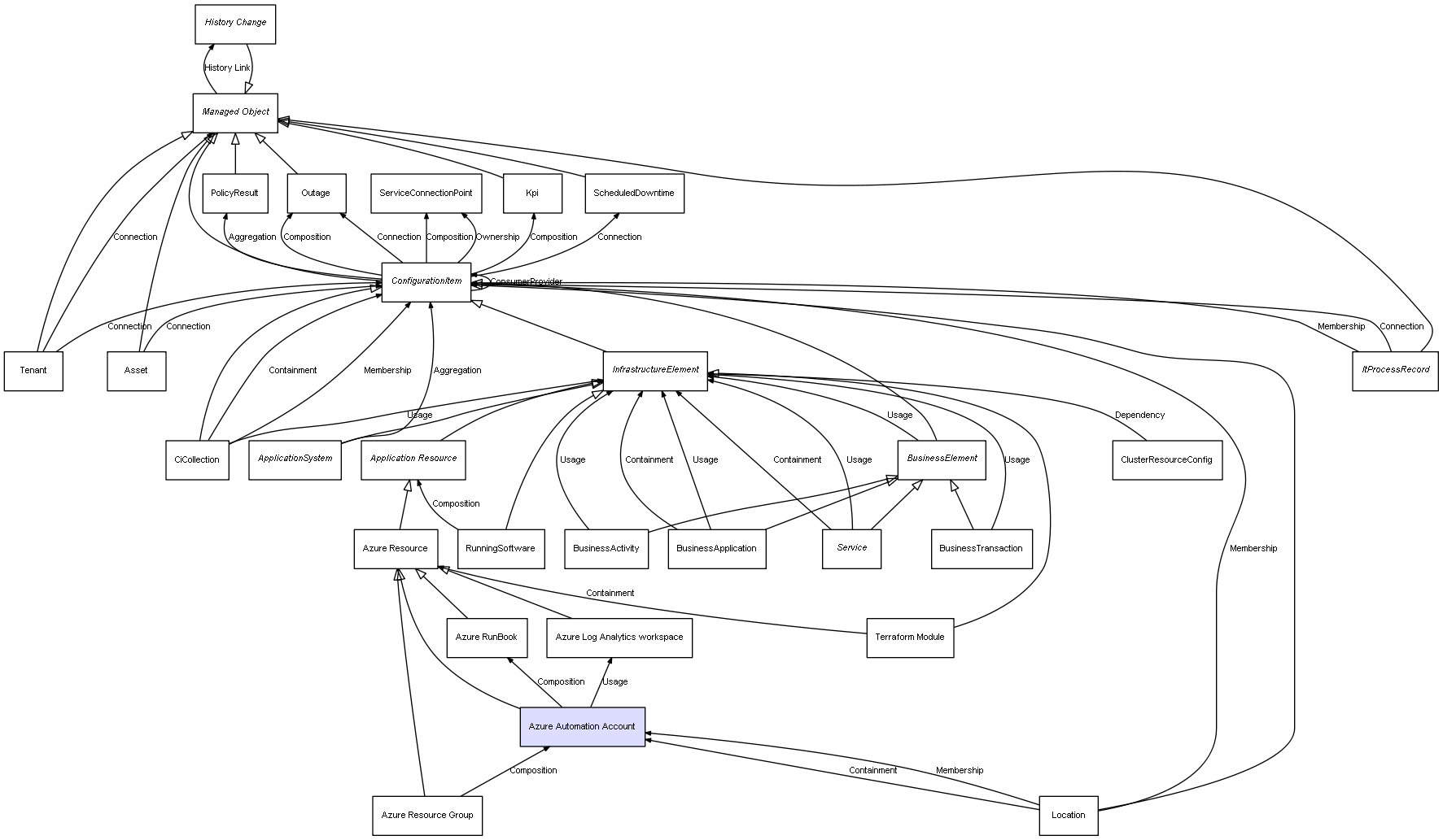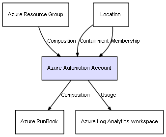 | Azure Automation Account | Azure RunBook | Composition | Represents a relation between 2 objects where one is contained within the other, and the included object can not exist without its container. Therefore, when the container is deleted, all its contained object will be automatically removed |