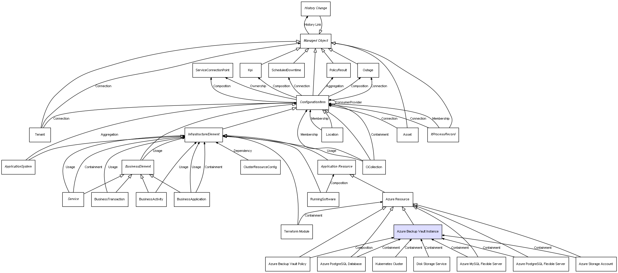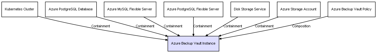 | Azure Backup Vault Policy | Azure Backup Vault Instance | Composition | Represents a relation between 2 objects where one is contained within the other, and the included object can not exist without its container. Therefore, when the container is deleted, all its contained object will be automatically removed |
