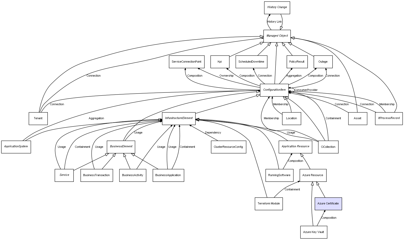 | Azure Key Vault | Azure Certificate | Composition | Represents a relation between 2 objects where one is contained within the other, and the included object can not exist without its container. Therefore, when the container is deleted, all its contained object will be automatically removed |