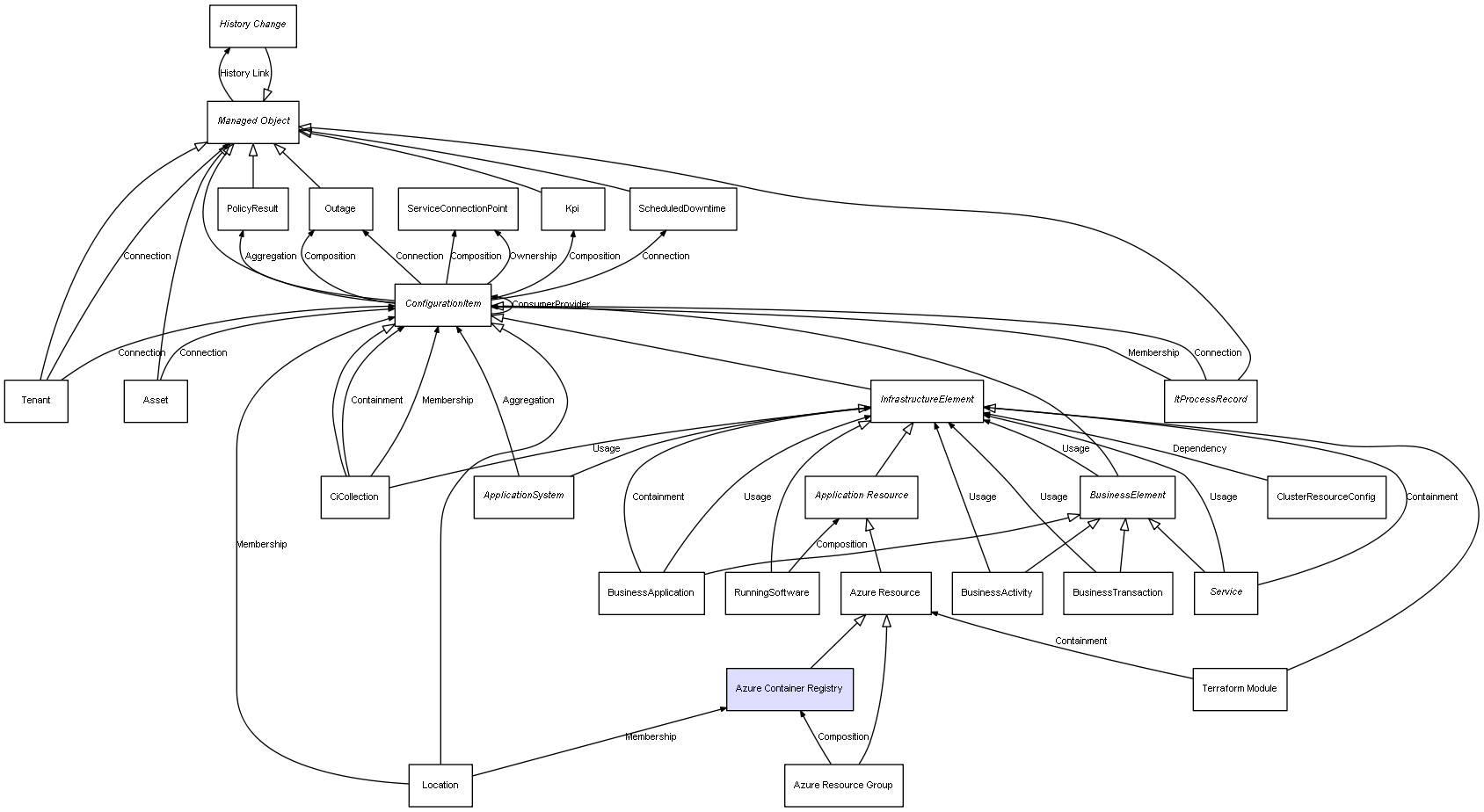 | Azure Resource Group | Azure Container Registry | Composition | Represents a relation between 2 objects where one is contained within the other, and the included object can not exist without its container. Therefore, when the container is deleted, all its contained object will be automatically removed |