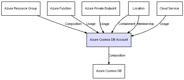 | Azure Resource Group | Azure Cosmos DB Account | Composition | Represents a relation between 2 objects where one is contained within the other, and the included object can not exist without its container. Therefore, when the container is deleted, all its contained object will be automatically removed |