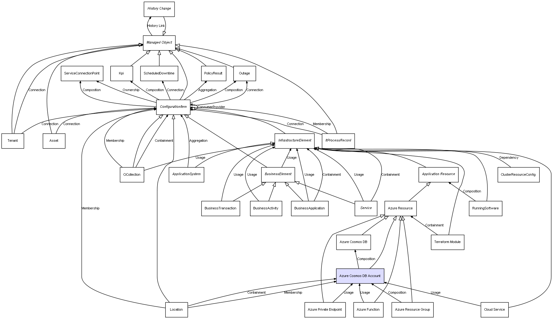 | Azure Cosmos DB Account | Azure Cosmos DB | Composition | Represents a relation between 2 objects where one is contained within the other, and the included object can not exist without its container. Therefore, when the container is deleted, all its contained object will be automatically removed |