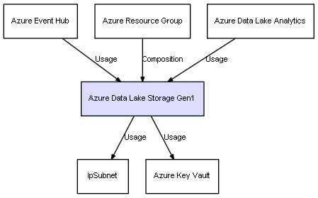 | Azure Resource Group | Azure Data Lake Storage Gen1 | Composition | Represents a relation between 2 objects where one is contained within the other, and the included object can not exist without its container. Therefore, when the container is deleted, all its contained object will be automatically removed |