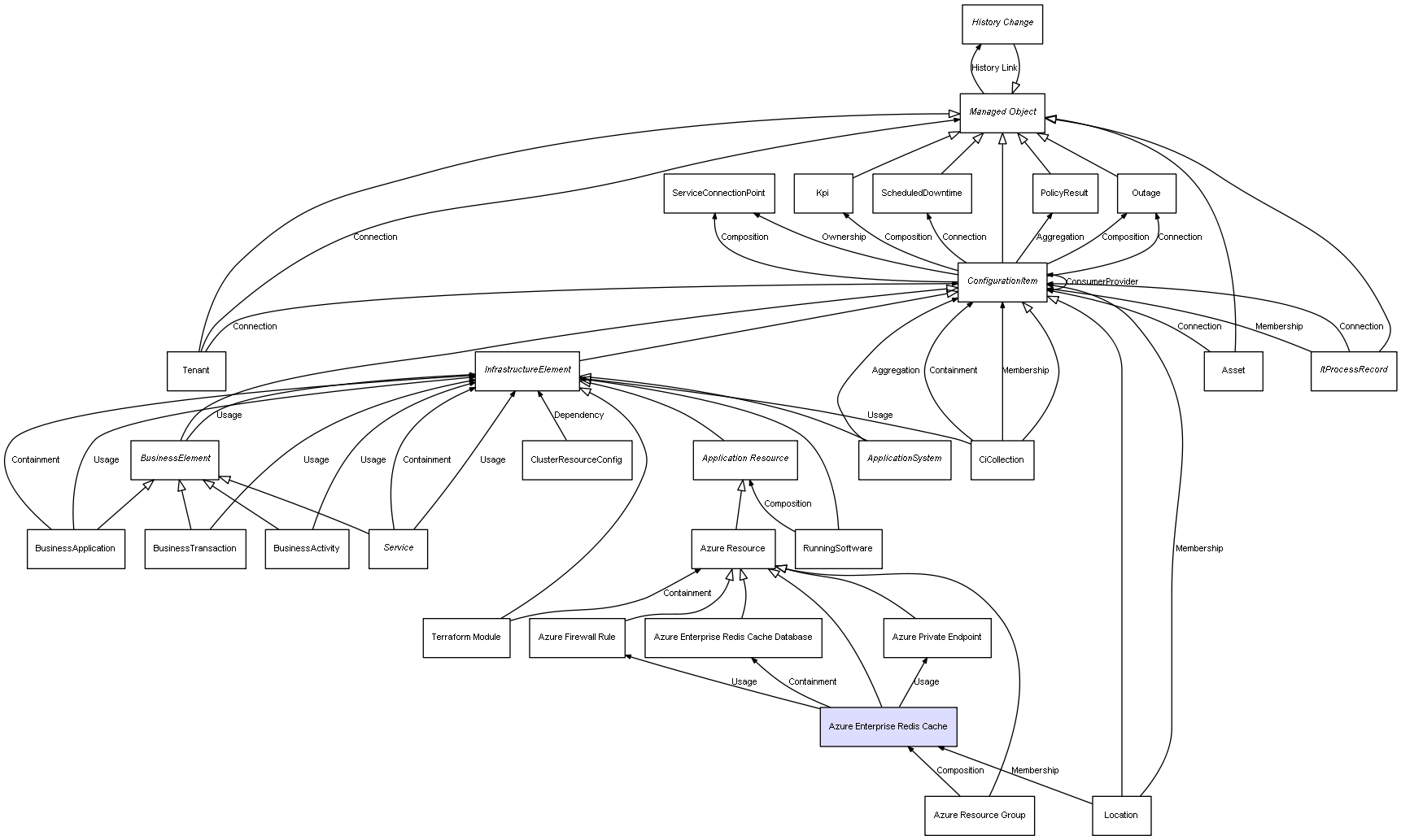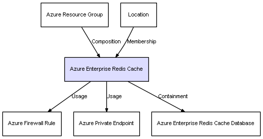 | Azure Resource Group | Azure Enterprise Redis Cache | Composition | Represents a relation between 2 objects where one is contained within the other, and the included object can not exist without its container. Therefore, when the container is deleted, all its contained object will be automatically removed |