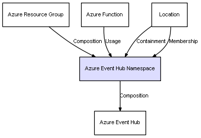 | Azure Resource Group | Azure Event Hub Namespace | Composition | Represents a relation between 2 objects where one is contained within the other, and the included object can not exist without its container. Therefore, when the container is deleted, all its contained object will be automatically removed |