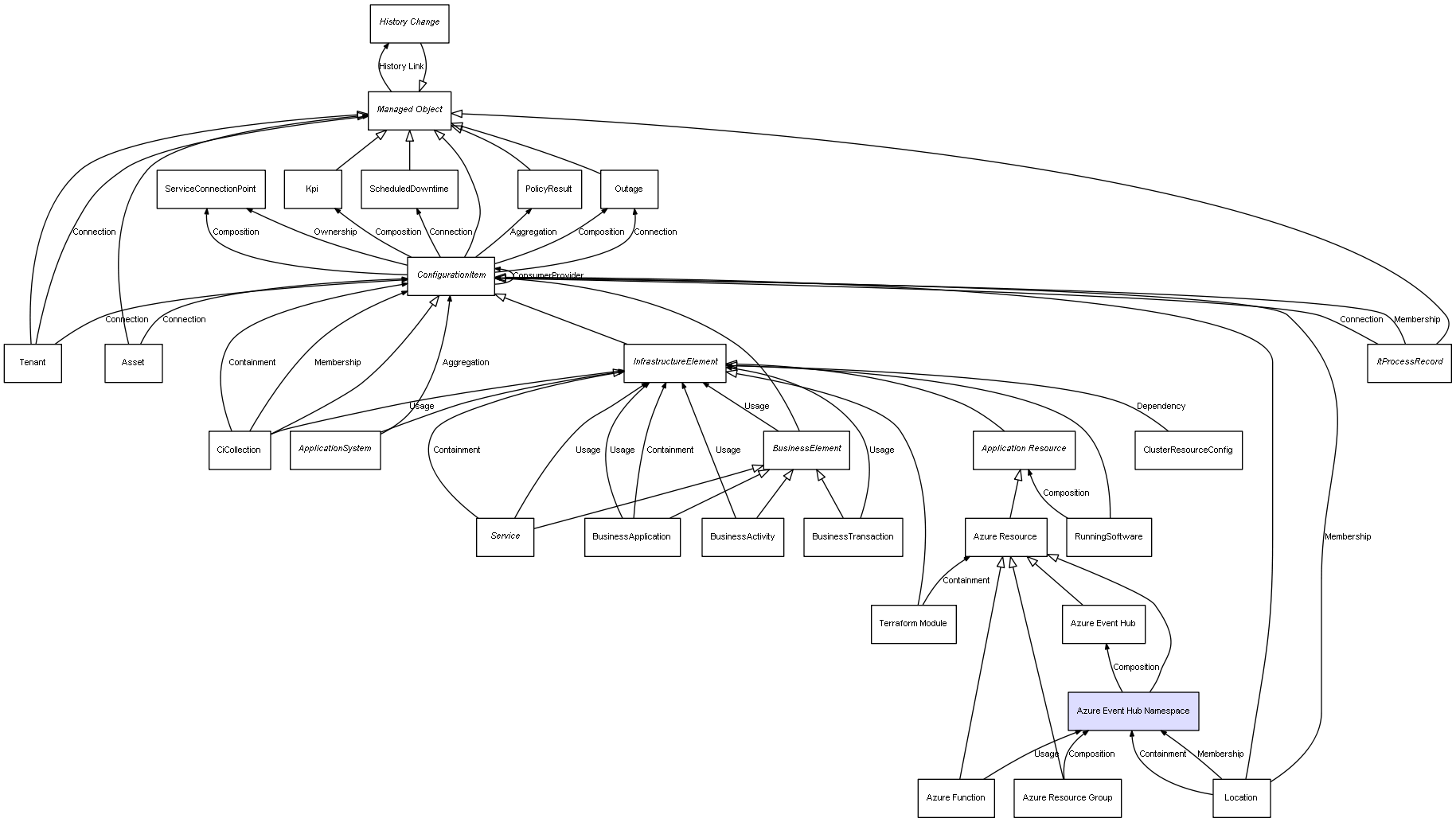 | Azure Event Hub Namespace | Azure Event Hub | Composition | Represents a relation between 2 objects where one is contained within the other, and the included object can not exist without its container. Therefore, when the container is deleted, all its contained object will be automatically removed |