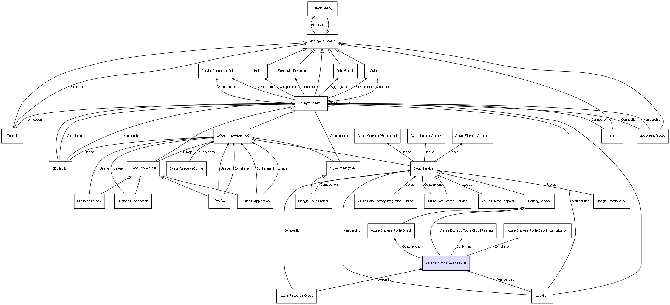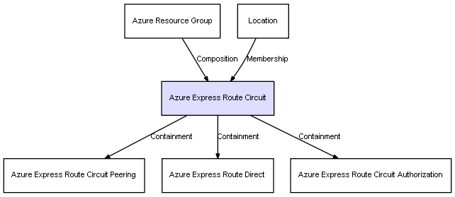 | Azure Resource Group | Azure Express Route Circuit | Composition | Represents a relation between 2 objects where one is contained within the other, and the included object can not exist without its container. Therefore, when the container is deleted, all its contained object will be automatically removed |