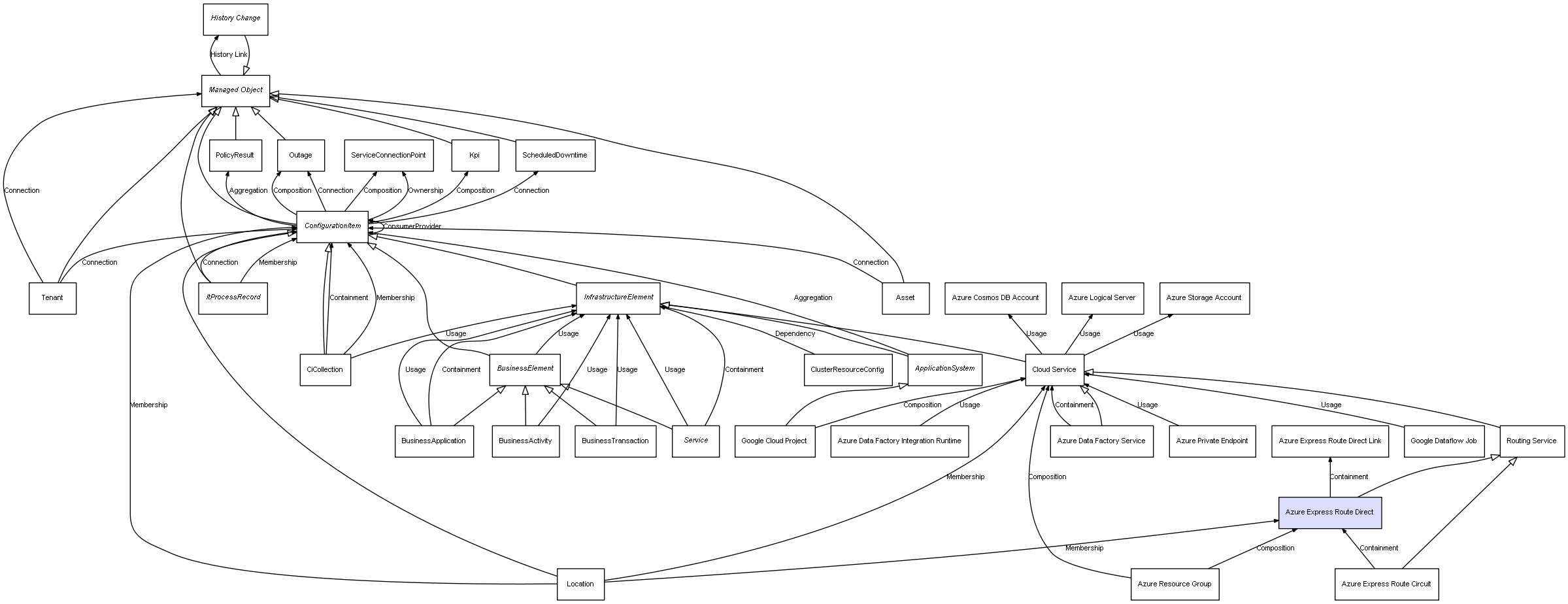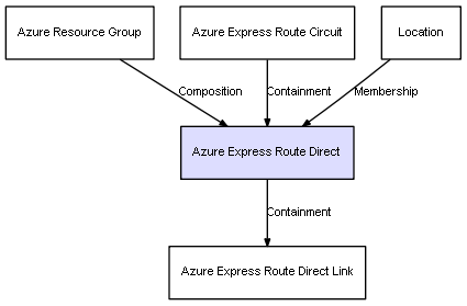 | Azure Resource Group | Azure Express Route Direct | Composition | Represents a relation between 2 objects where one is contained within the other, and the included object can not exist without its container. Therefore, when the container is deleted, all its contained object will be automatically removed |