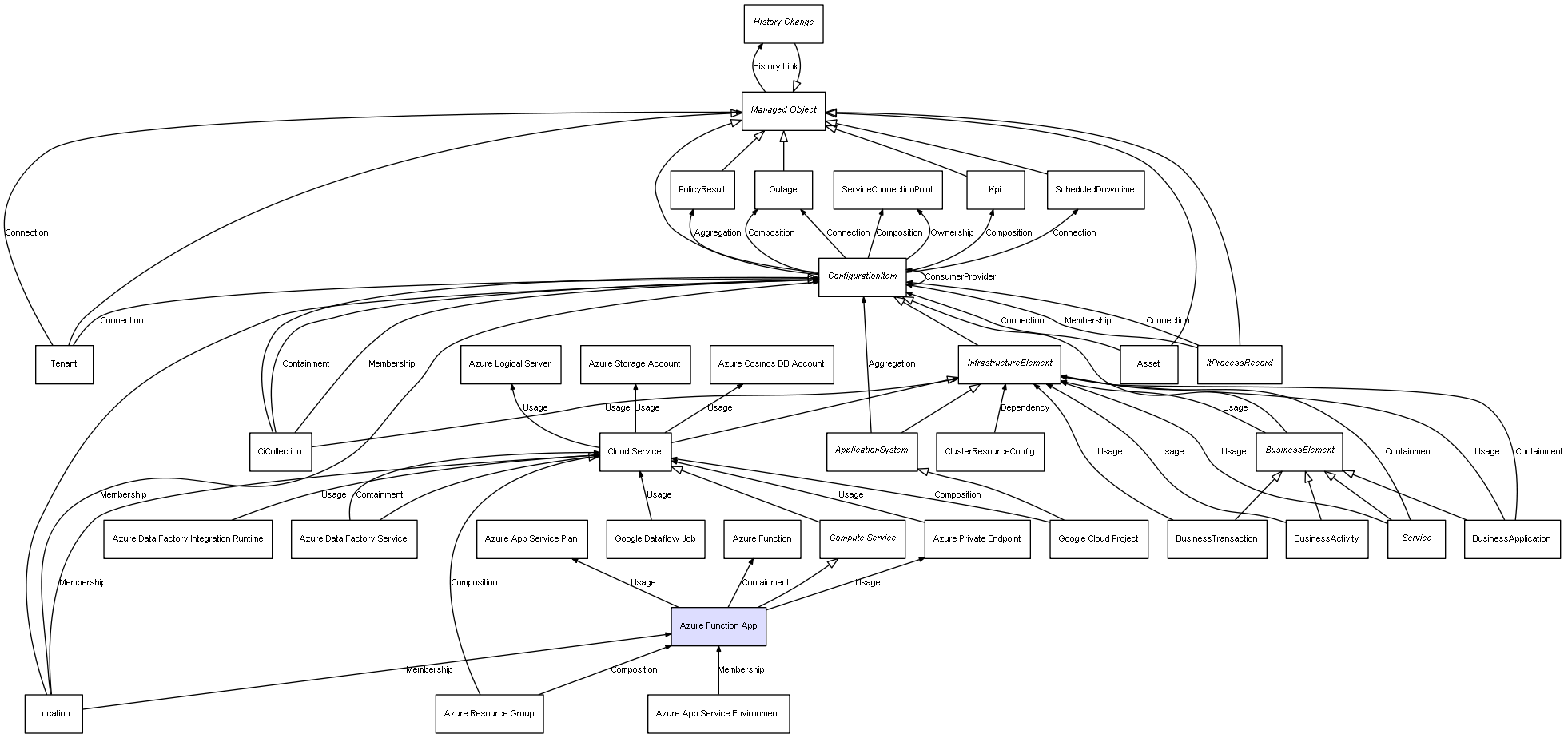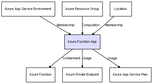 | Azure Resource Group | Azure Function App | Composition | Represents a relation between 2 objects where one is contained within the other, and the included object can not exist without its container. Therefore, when the container is deleted, all its contained object will be automatically removed |