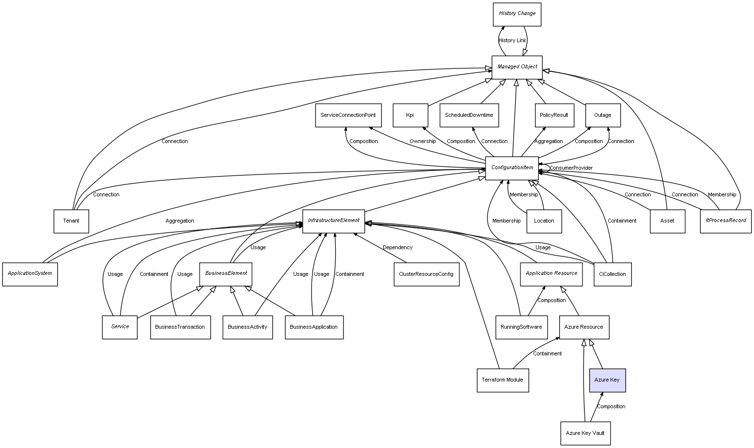 | Azure Key Vault | Azure Key | Composition | Represents a relation between 2 objects where one is contained within the other, and the included object can not exist without its container. Therefore, when the container is deleted, all its contained object will be automatically removed |