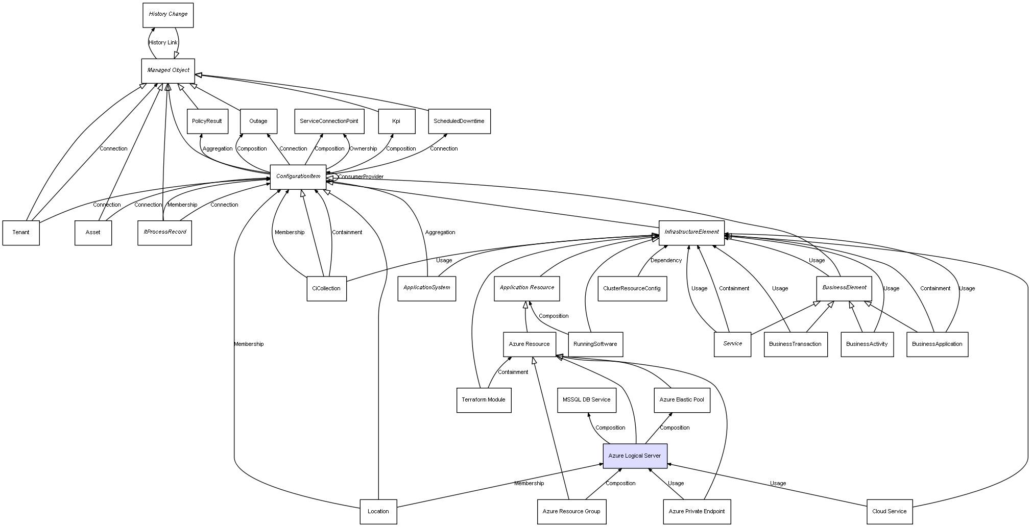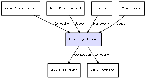 | Azure Logical Server | MSSQL DB Service | Composition | Represents a relation between 2 objects where one is contained within the other, and the included object can not exist without its container. Therefore, when the container is deleted, all its contained object will be automatically removed |