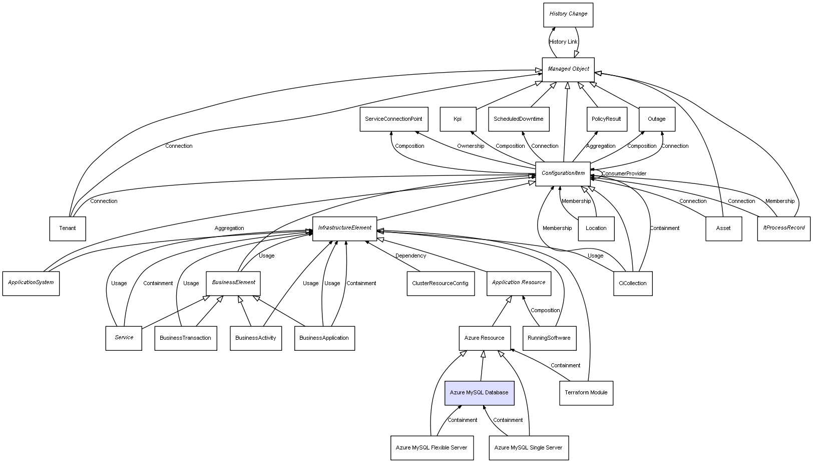 Combined inheritance and relation diagram for Azure MySQL Database
