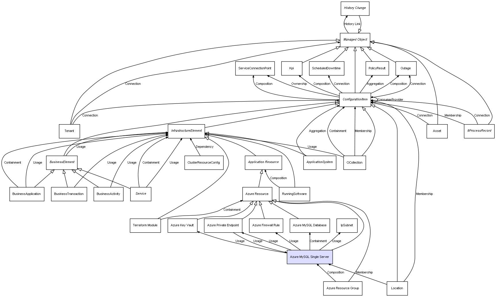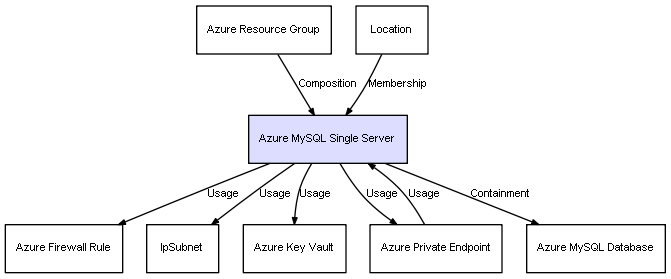 | Azure Resource Group | Azure MySQL Single Server | Composition | Represents a relation between 2 objects where one is contained within the other, and the included object can not exist without its container. Therefore, when the container is deleted, all its contained object will be automatically removed |