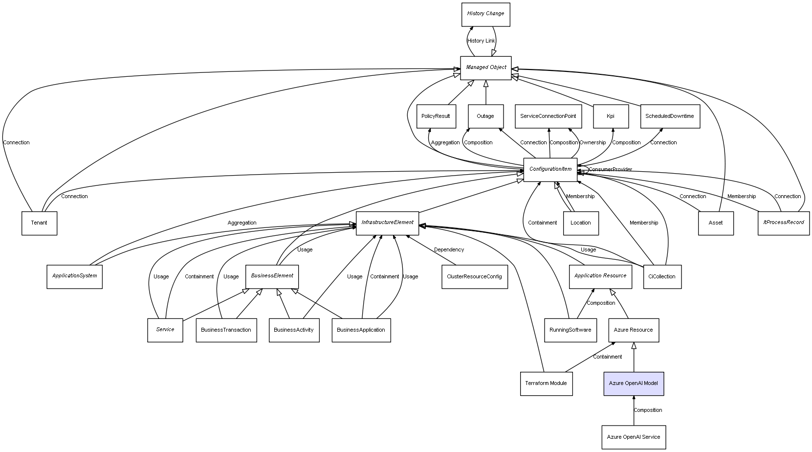| Azure OpenAI Service | Azure OpenAI Model | Composition | Represents a relation between 2 objects where one is contained within the other, and the included object can not exist without its container. Therefore, when the container is deleted, all its contained object will be automatically removed |