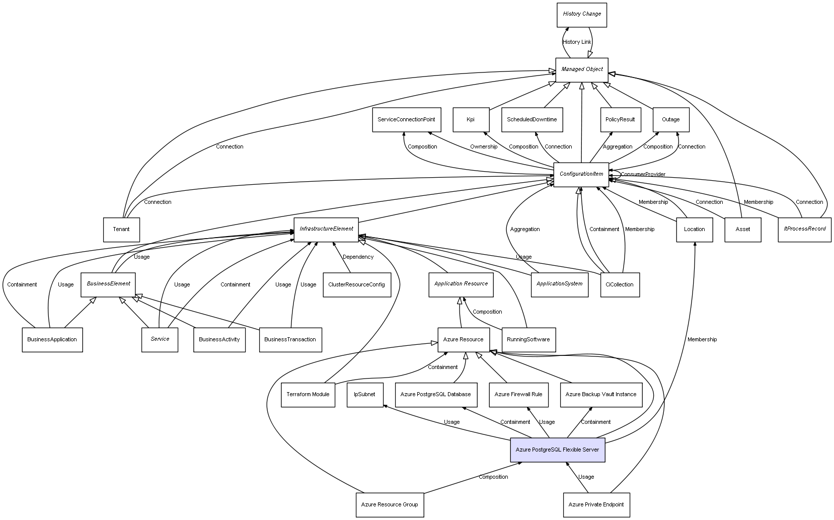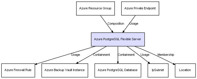 | Azure Resource Group | Azure PostgreSQL Flexible Server | Composition | Represents a relation between 2 objects where one is contained within the other, and the included object can not exist without its container. Therefore, when the container is deleted, all its contained object will be automatically removed |