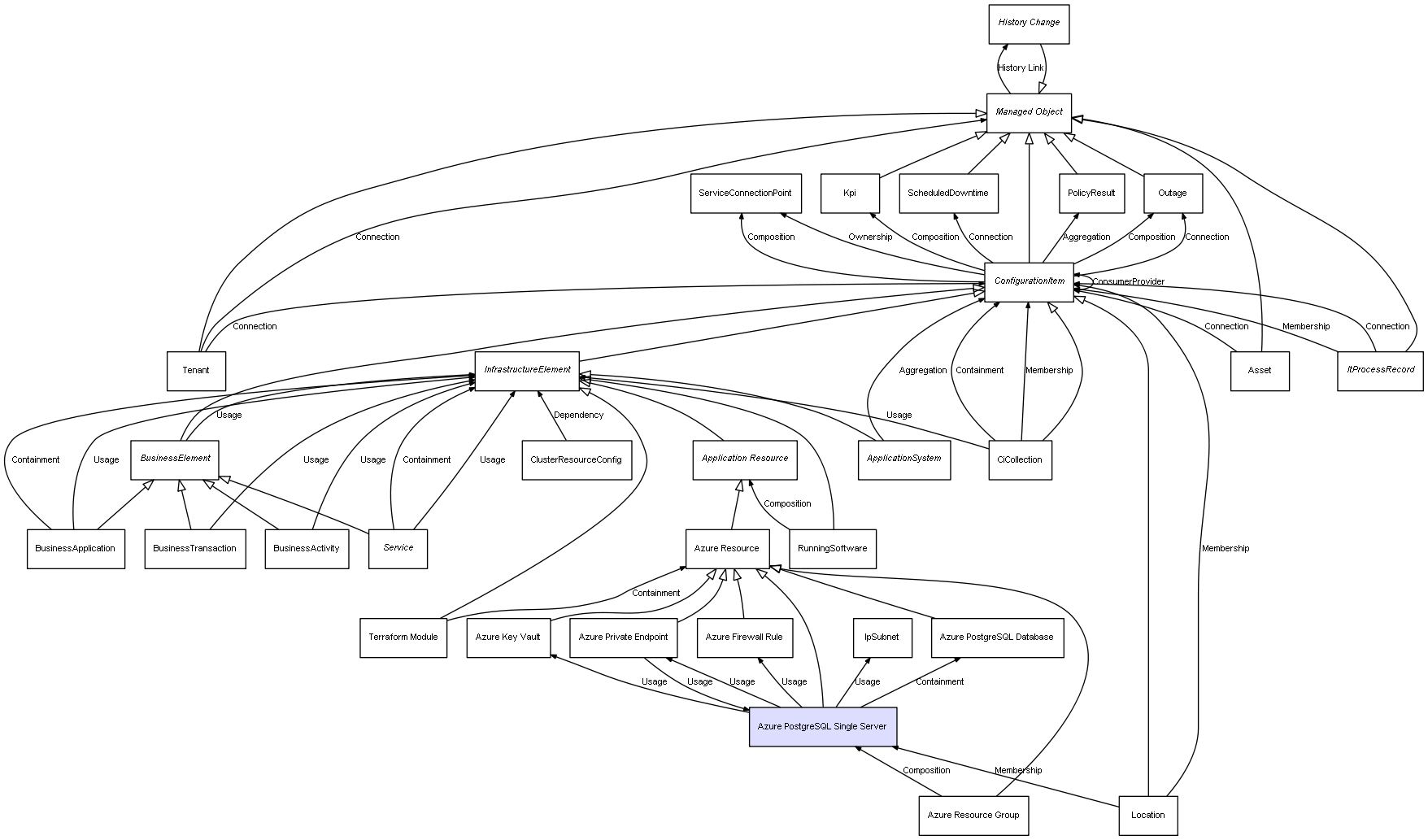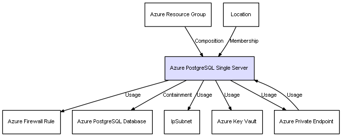 | Azure Resource Group | Azure PostgreSQL Single Server | Composition | Represents a relation between 2 objects where one is contained within the other, and the included object can not exist without its container. Therefore, when the container is deleted, all its contained object will be automatically removed |