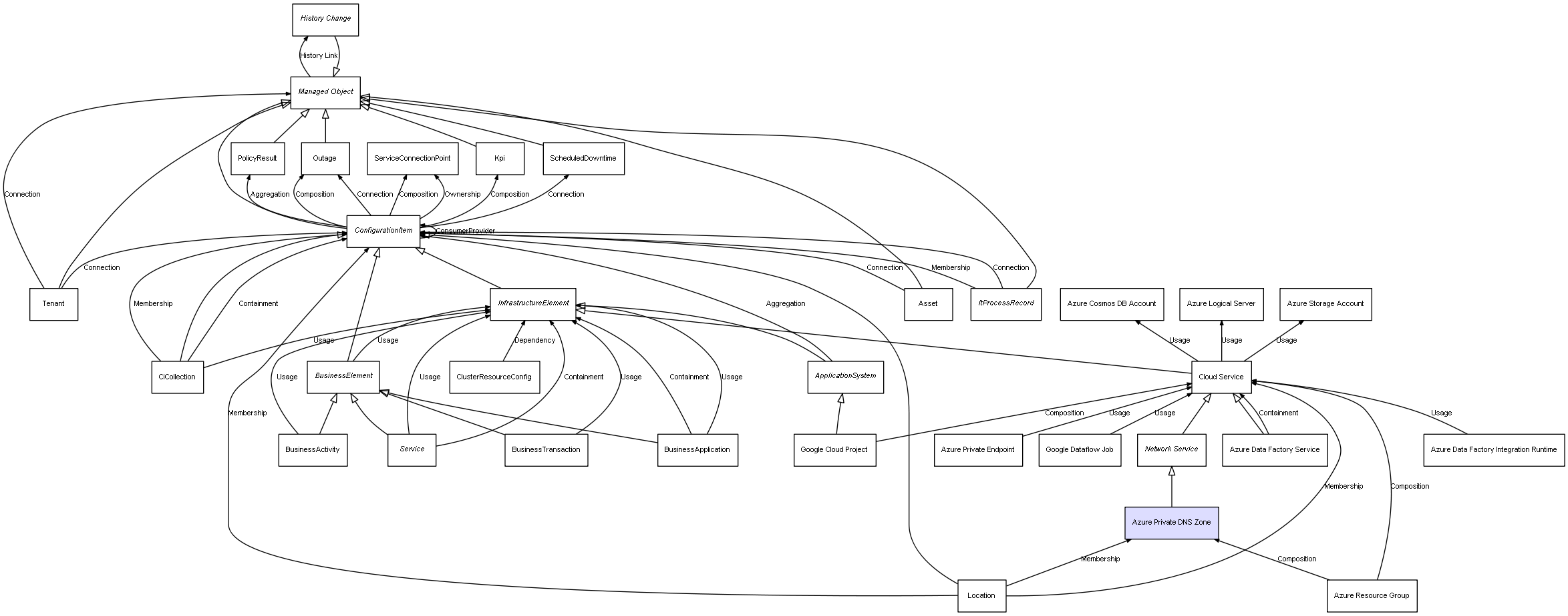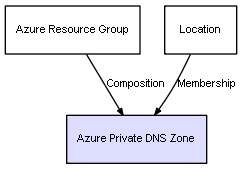| Azure Resource Group | Azure Private DNS Zone | Composition | Represents a relation between 2 objects where one is contained within the other, and the included object can not exist without its container. Therefore, when the container is deleted, all its contained object will be automatically removed |