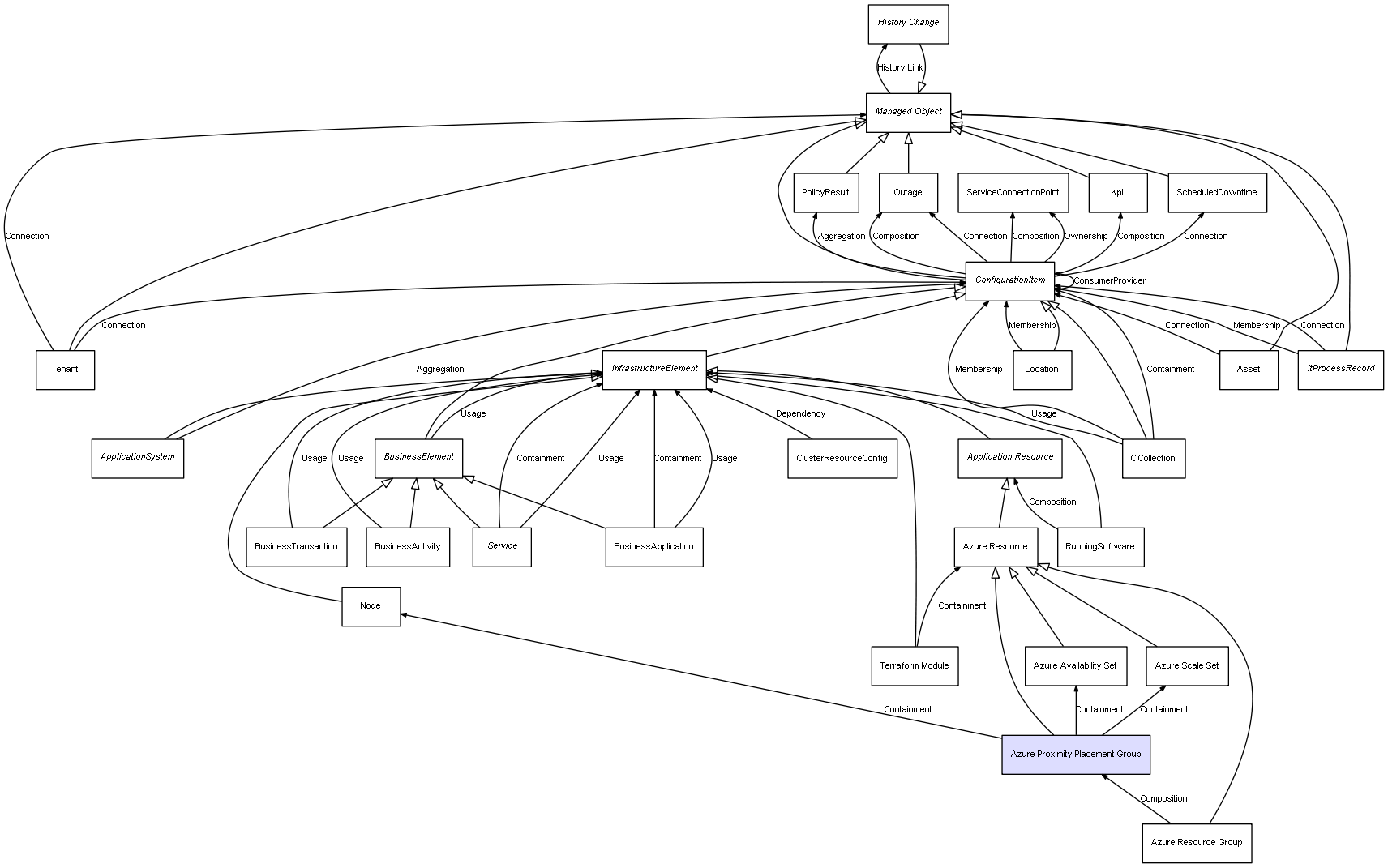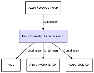 | Azure Resource Group | Azure Proximity Placement Group | Composition | Represents a relation between 2 objects where one is contained within the other, and the included object can not exist without its container. Therefore, when the container is deleted, all its contained object will be automatically removed |