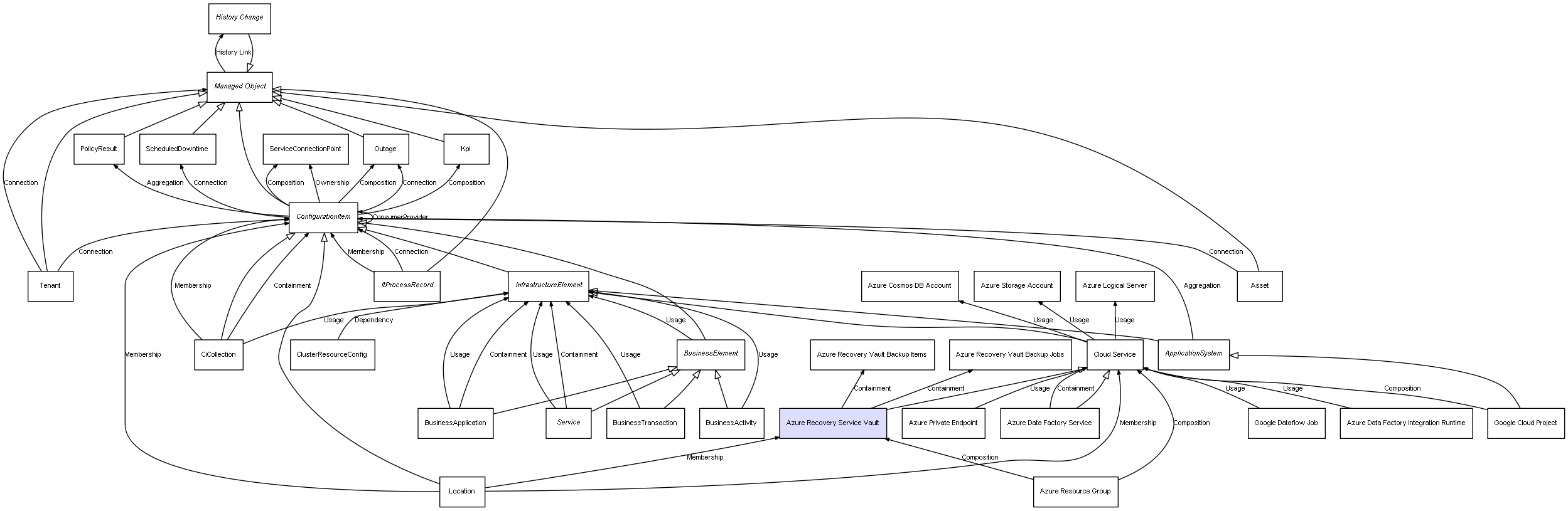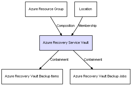 | Azure Resource Group | Azure Recovery Service Vault | Composition | Represents a relation between 2 objects where one is contained within the other, and the included object can not exist without its container. Therefore, when the container is deleted, all its contained object will be automatically removed |