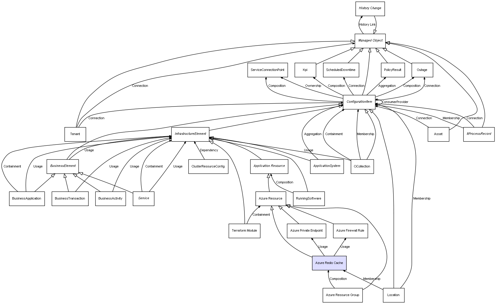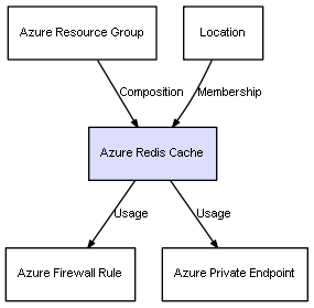 | Azure Resource Group | Azure Redis Cache | Composition | Represents a relation between 2 objects where one is contained within the other, and the included object can not exist without its container. Therefore, when the container is deleted, all its contained object will be automatically removed |