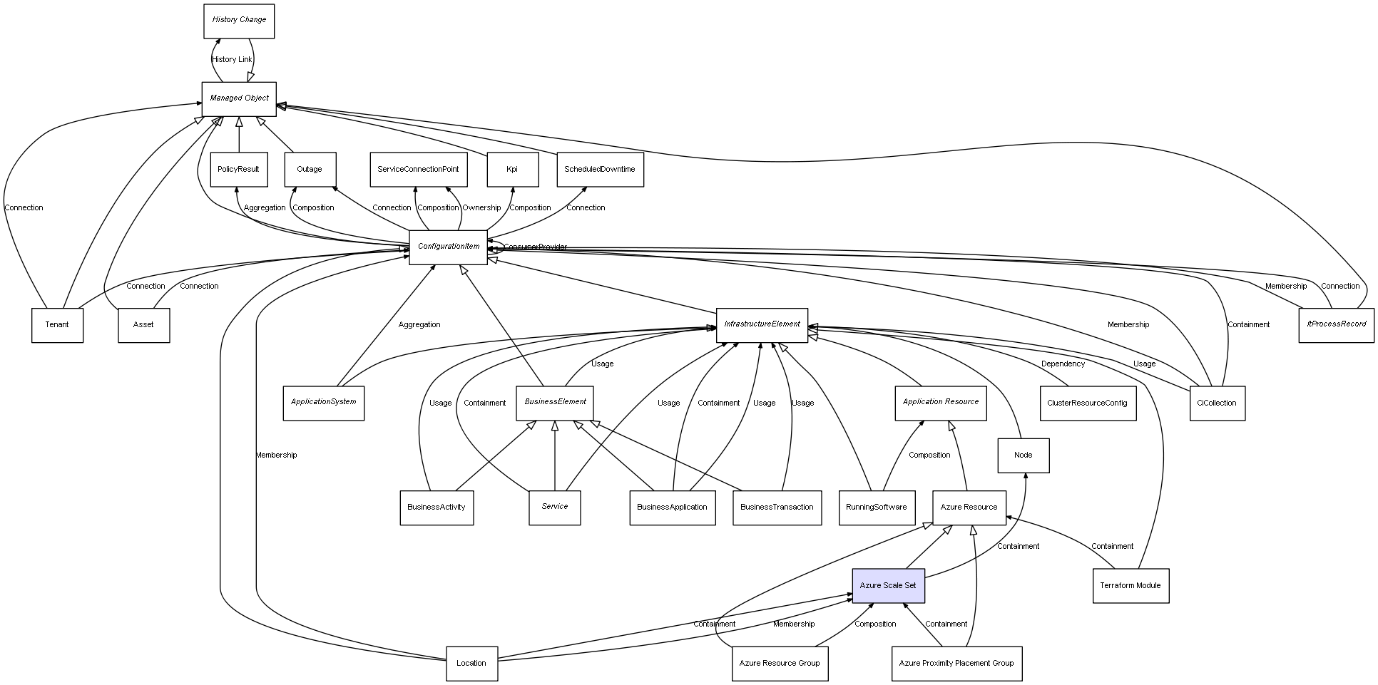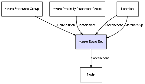 | Azure Resource Group | Azure Scale Set | Composition | Represents a relation between 2 objects where one is contained within the other, and the included object can not exist without its container. Therefore, when the container is deleted, all its contained object will be automatically removed |