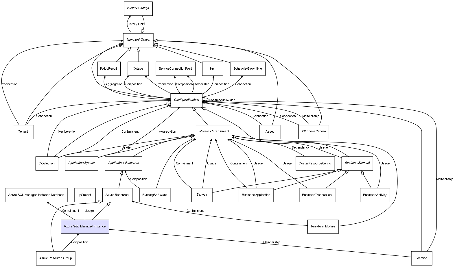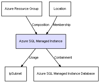| Azure Resource Group | Azure SQL Managed Instance | Composition | Represents a relation between 2 objects where one is contained within the other, and the included object can not exist without its container. Therefore, when the container is deleted, all its contained object will be automatically removed |